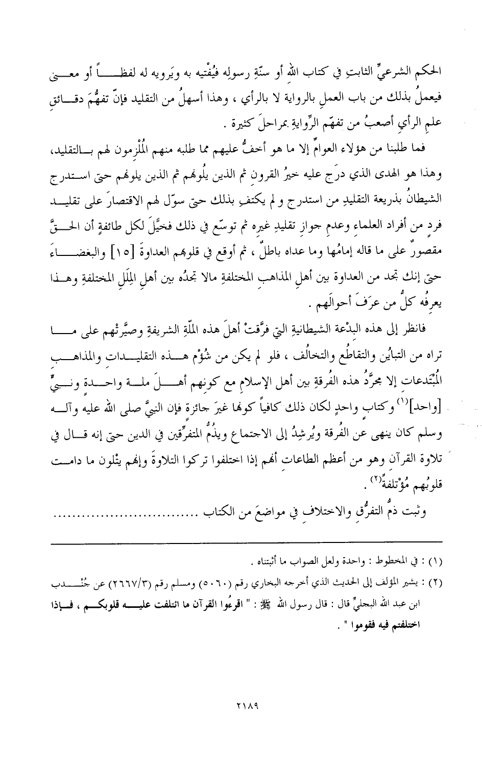 فانظر إلى هذه البدعة الشيطانية التي فرقت أهل الملة الشريفة وصيرتهم على ما تراه من التباين والتقاطع والتخالف، فلو لم يكن من شؤم هذه التقليدات والذاهب المبتدعات إلا مجرد هذه الفرقة بين أهل الإسلام مع كونهم أهل مله واحدة ونبي [واحد] (¬1) وكتاب واحد لكان ذلك كافيا كونها غير جائزة فإن النبي- صَلَّى اللهُ عَلَيْهِ وَآلِهِ وَسَلَّمَ- كان ينهى عن الفرقة ويرشد إلى الاجتماع ويذم المتفرقين في الدين حتى إنه قال في تلاوة القرآن وهو من أعظم الطاعات أنهم إذا اختلفوا تركوا التلاوة وأنهم يتلون ما دامت قلوبهم مؤتلفة (¬2).