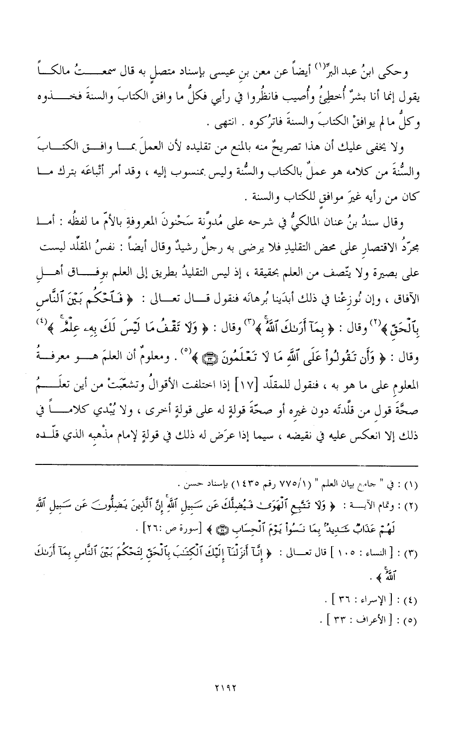 وقال سند بن عنان الملكي في شرحه على مدونة سحنون المعورفة بالأم ما لفظة: أما مجرد الاقتصار على محض التقليد فلا يرضى به رجل رشيد وقال أيضا: نفس المقلد ليست على بصيرة ولا يتصف من العلم بحقيقة، إذ ليس التقليد بطريق إلى العلم بوفاق أهل الآفاق، وإن نوزعنا في ذلك أبدينا برهانه فنقول قال تعالى: {فاحكم بين الناس بالحق} (¬2) وقال: {بما أرك الله} (¬3) وقال: {ولا تقف ما ليس لك به علم} (¬4) وقال: {وأن تقولوا على الله ما لا تعلمون} (¬5) ومعلوم أن العلم هو معرفة المعلوم على ما هو به، فنقول للمقلد [17] إذا اختلفت الأقوال وتشعبت من أين تعلم صحة قول من قلدته دون غيره أو صحة قولة له أخرى، ولا يبدى كلاما في ذلك إلانعكس عليه في نقيضه. سيما إذا عرض له قولة لإمام مذهبه الذي قلده
