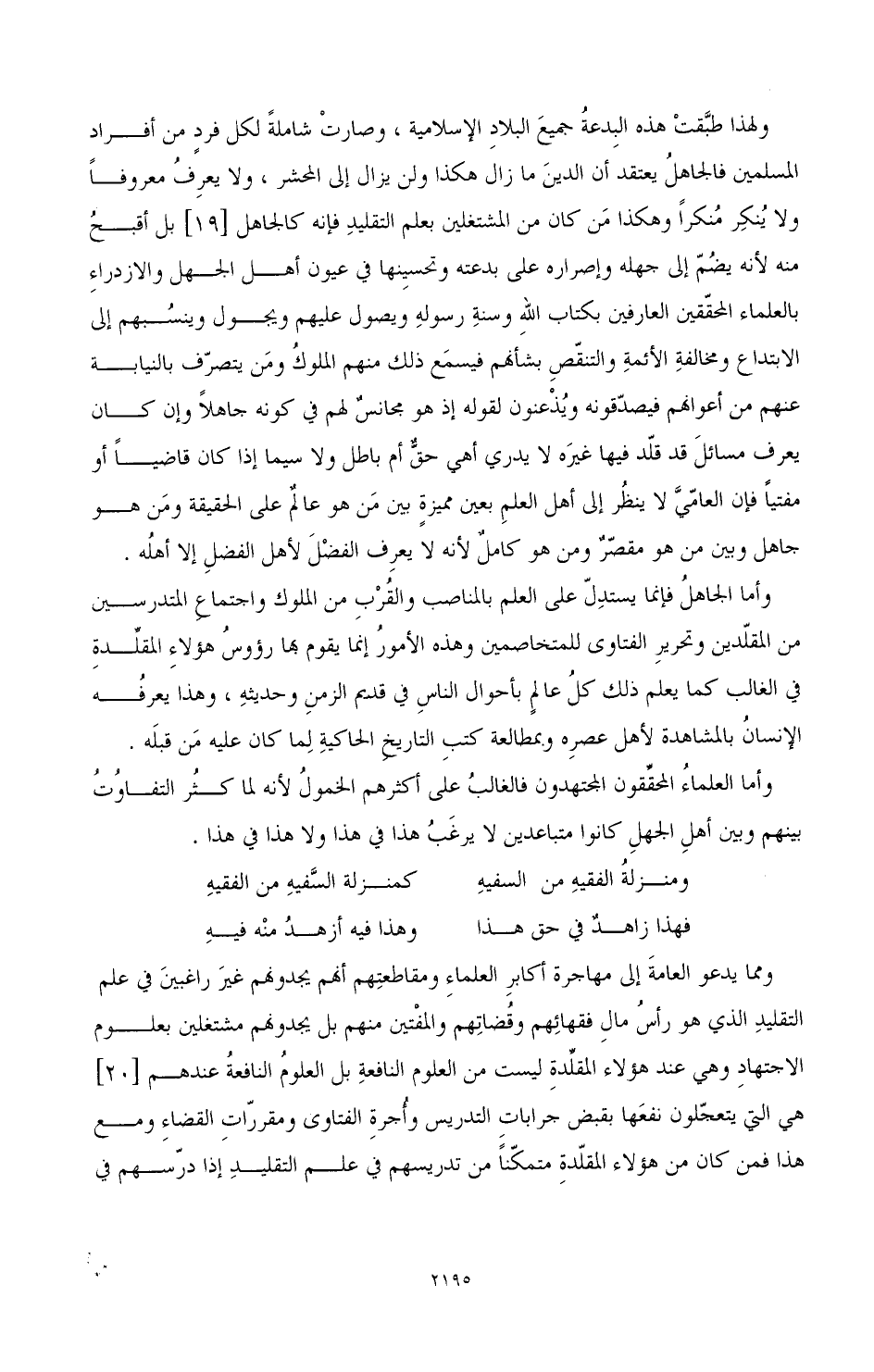 ولهذا طبقت هذه البدعة جميع البلاد الإسلامية، وصارت شاملة لكل فرد من أفراد المسلمين فالجاهل يعتقد أن الدين ما زال هكذا ولن يزال إلبى المحشر، ولا يعرف معروفا وال ينكر منكراً وهكذا من كان من المشتغلين بعلم التقليد فإنه كالجاهل [19] بل أقبح منه لأنه يضم إلى جهله وإصراره على بدعته وتحسينها في عيون أهل الجهل والازدراء بالعلماء المحققين العارفين بكتاب الله وسنة رسوله ويصول عليهم ويحول وينسبهم إلى الابتداع ومخالفة الأئمة والتنقص بشأنهم فيسمع ذلك منهم الملوك ومن يتصرف بالنيابة عنهم من أعوانهم فيصدقونه ويذعنون لقوله إذ هو مجانس لهم في كونه جاهلاً وإن كان يعرف مسائل قد قلد فيها غيره لا يدري أهي حق أم باطل ولا سيما إذا كان قاضيا ً أو مفتيا فإن العامي لا ينظر إلى أهل العلم بعين مميزة بين من هو عالم على الحقيقة ومن هو جاهل وبين من هو مقصر ومن هو كامل لأنه لا يعرف الفضل لأهل الفضل إلا أهله.