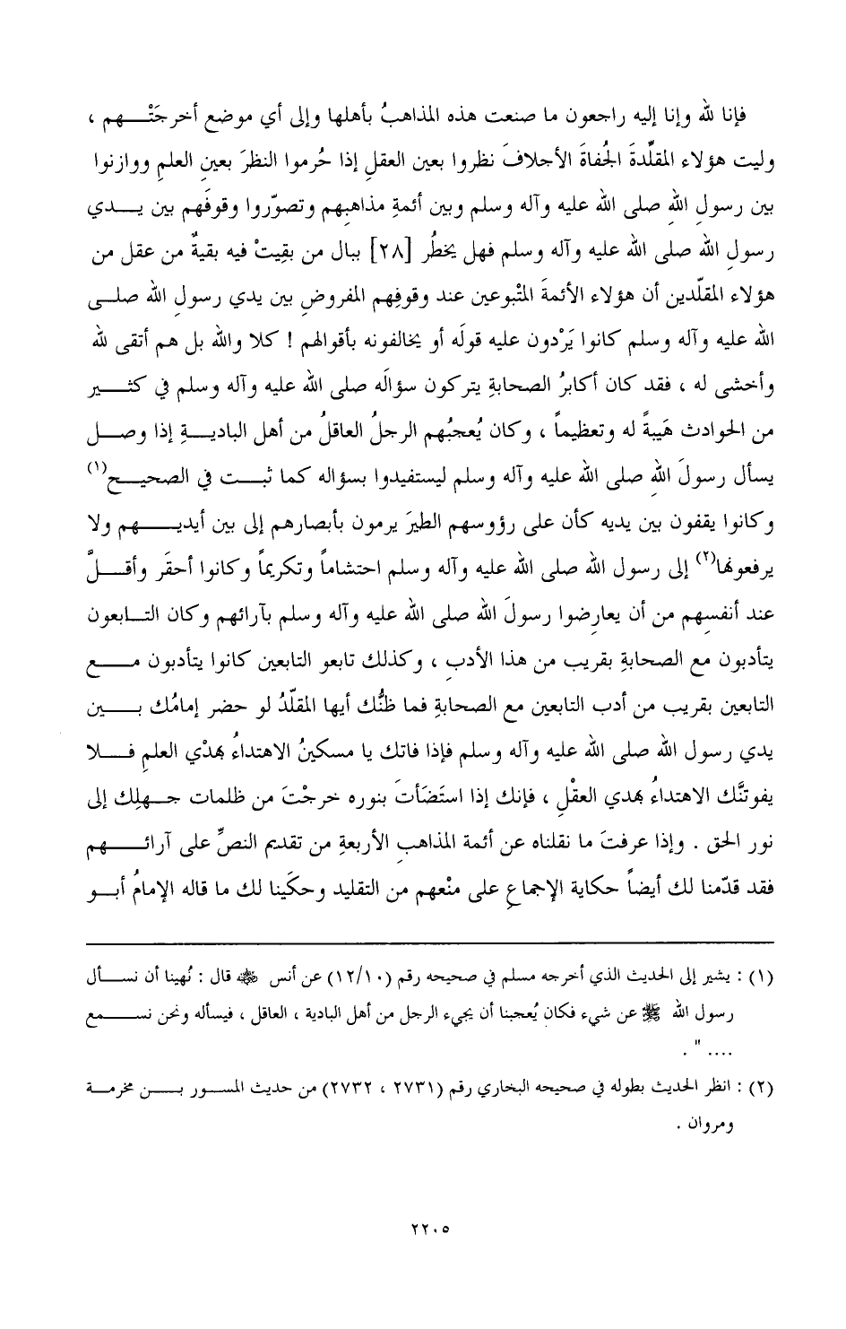 فإنا لله وإنا إليه راجعون ما صنعت هذه المذاهب بأهلها وإلى أي موضع أخر أخرجتهم، وليت هؤلاء المقلدة الجفاة الأجلاف نظروا بعين العقل إذا حرموا النظر بعين العلم ووازنوا بين رسول الله- صَلَّى اللهُ عَلَيْهِ وَآلِهِ وَسَلَّمَ- وبين أئمة مذاهبهم وتصوروا وقوفهم بين يدي رسول الله- صَلَّى اللهُ عَلَيْهِ وَآلِهِ وَسَلَّمَ- فهل يخطر [28] ببال من بقيت فيه بقية من عقل هؤلاء المقلدين أن هؤلاء الأئمة المتبوعين عند وقوفهم المفروض بين يدي رسول الله- صَلَّى اللهُ عَلَيْهِ وَآلِهِ وَسَلَّمَ- كانوا يردون عليه قوله أو يخالفونه بأقوالهم! كلا والله بل هم أتقى لله وأخشى له، فقد كان أكابر الصحابة يتركون سؤاله- صَلَّى اللهُ عَلَيْهِ وَآلِهِ وَسَلَّمَ- في كثير من الحوادث هيبة له وتعظيما، وكان يعجبهم الرجل العاقل من أهل البادية إذا وصل يسأل رسول الله- صَلَّى اللهُ عَلَيْهِ وَآلِهِ وَسَلَّمَ- ليستفيدوا بسؤاله كما ثبت في الصحيح (¬1) وكانوا يقفون بين يديه كأن على رؤوسهم الطجير يرمون بأبصارهم إلى بين أيديهم ولا يرفعونها (¬2) إلى رسول الله- صَلَّى اللهُ عَلَيْهِ وَآلِهِ وَسَلَّمَ- احتشاماً وتكريما وكانوا أحقر وأقل عند أنفسهم من أن يعارضوا رسول الله صلى عليه وآله وسلم بآرائهم وكان التابعون يتأديون مع الصحابة بقريب من هذا الأددب، وكذلك تابعو التابعين كانوا يتأدبون مع التابعين بقريب من أدب التابعين مع الصحابة فما ظنك أيها المقلد لو حضر إمامك بين يدي رسول الله- صلى عليه وآله وسلم- فإتك يا مسكين الاهتداء بهدى العلم فلا يفوتنك الاهتداء بهدى العقل، فإنك إذا استضأت بنوره خرجت من ظلمات جهلك إلى نور الحق. وإذا عرفت ما قدمنا لك أيضًا حكاية الإجماع على منعهم من التقليد وحكينا لك ما قاله الإمام أبو