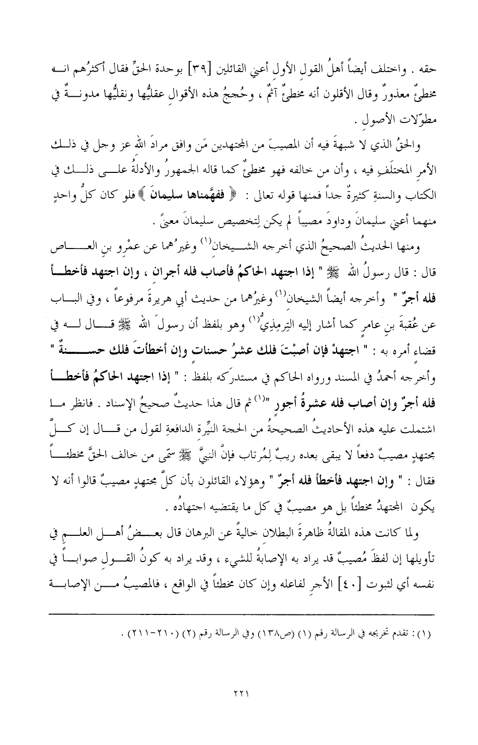 ولما كانت هذه المقالة ظاهرة البطلان خالية عن البرهان قال بعض أهل العلم في تأويلها: إن لفظ مصيب قد يراد به الإصابة للشيء، وقد يراد به كون القول صوابا في نفسه أي لثبوت [40] الأجر لفاعله، وإن كان مخطئا في الواقع، فالمصيب من الإصابة
