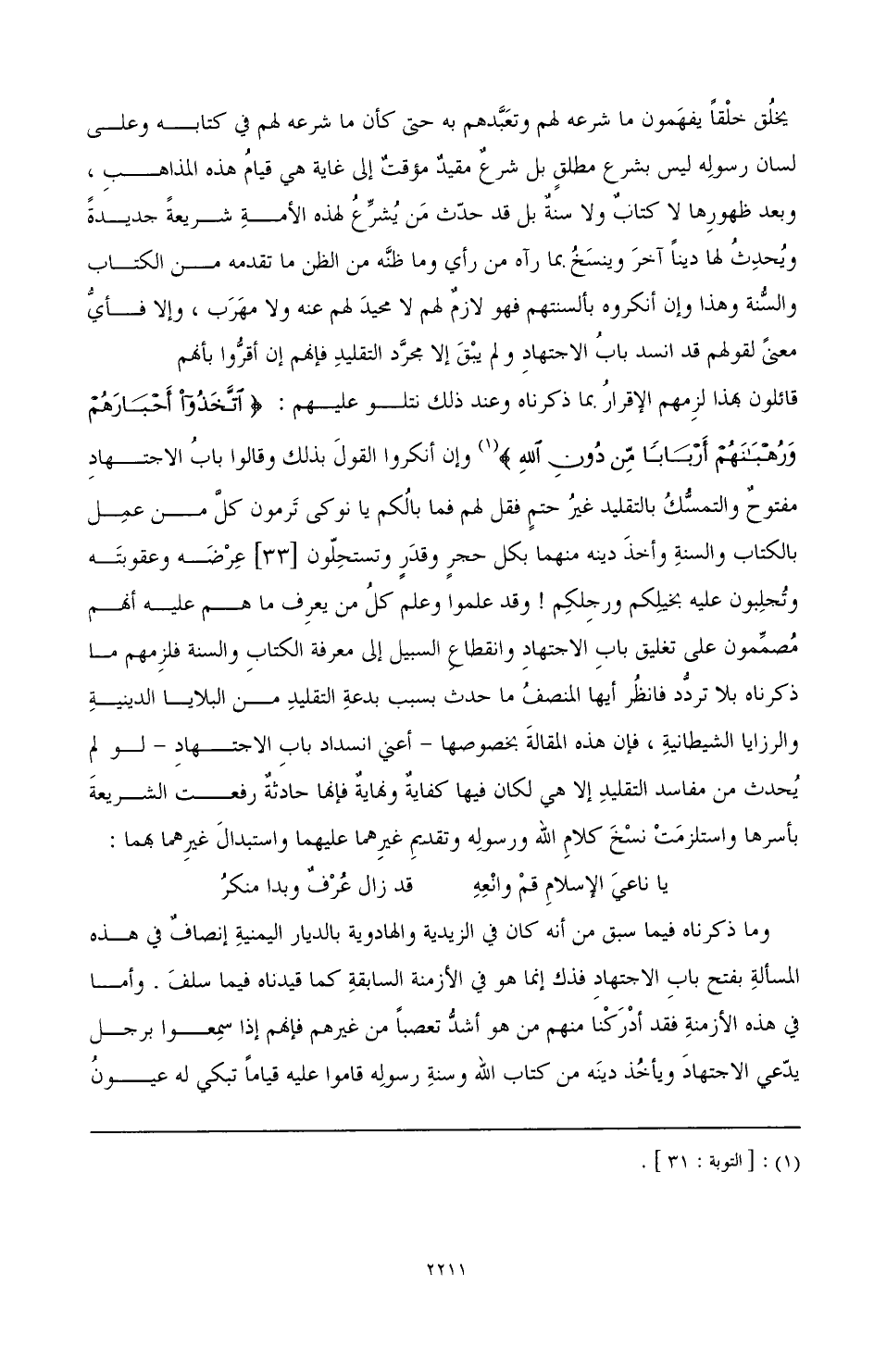 يخلق خلقا يهمون ما شرعه لهم وتعبدهم به حتى كأن ما شرعه لهم في كتابه وعلى لسان رسوله ليس بشرع مطلق بل شرع مقيد مؤقت إلى غاية هي قيام هذه المذاهب، وبعد ظهورها لا كتاب ولا سنة بل قد حدث من يشرع لهذه الأمة شريعة جديدة ويحدث لها دينا آخر وينسخ بما رآه من رأي وما ظنه من الطن ما تقدمه من الكتاب والسنة وهذا وإن أنكروه بألسنتهم فهو لازم لهم لا محيد لهم عنه ولامهرب، وإلا فأي معنى لقولهم قد انسد باب الاجتهاد ولم يبق إلا مجرد التقليد فإنهم إن أقروا بأنهم قائلون بهذا لزمهم الإقرار بما ذكرناه وعند ذلك نتلو عليهم {اتخذوا أحبارهم ورهبنهم أربابا من دون الله} [التوبة 31] وإن أنكروا القول بذلك وقالوا باب الاجتهاد مفتوح والتمسك بالتقليد غير حتم فقل لهم فما بالكم يانوكي ترمون كل من عمل بالكتاب والسنة وأخذ دينه منهما بكل حجر وقدر وتستحلون [33] عرضه وعقوبته وتجلبون عليه بخيلكم ورجلكم! وقد علموا وعلم كل من يعرف ما هب عليه أنهم مصممون على تغليق باب الاجتهاد وانقطاع السبيل إلى معرفة الكتاب والسنة فلزمهم ما ذكرناه بلا تردد فأنظر أيها المنصف ما حدث بسبب بدعة التقليد من البلايا الدينية والرزايا الشيطانية، فإن هذه المقالة بخصوصها- أعني انسداد باب الاجتهاد- لو لم يحدث من مفاسد التقيد إلا هي لكان فيها كفاية ونهاية فإنها حادثة رفعت الشريعة بأسرها واستلزمت نسخ كلام الله ورسوله وتقديم غيرهما عليهما واستبدال غيرهما بهما: