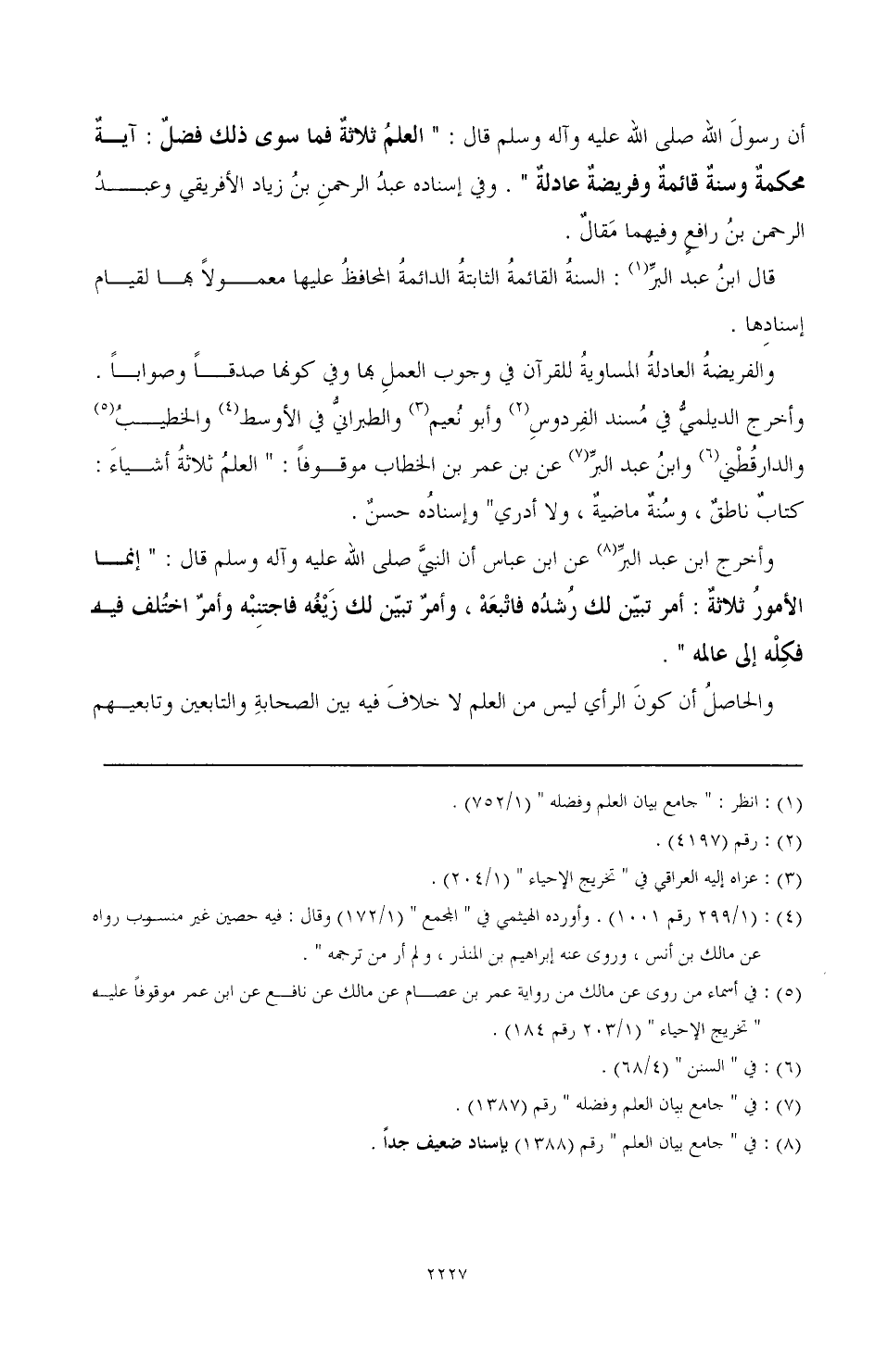 أن رسول الله- صَلَّى اللهُ عَلَيْهِ وَآلِهِ وَسَلَّمَ- قال: «العلم ثلاثة فما سوى ذلك فضلٌ: آية محكمة وسنة قائمة وفريضة عادلة». وفي إسناده عبد الرحمن بن زياد الأفريقي وعبد الرحمن بن رافع وفيهما مقال.