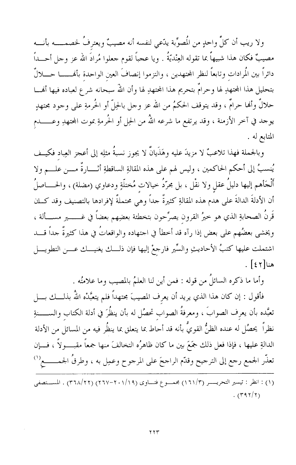 والحاصل أن الأدلة الدالة على هدم هذه المقالة كثيرة جدا وهي محتملة لإفرادها بالتصنيف، وقد كان قرن الصحابة الذي هو خير القرون يصرحون بتخطئة بعضهم بعضا في غير مسألة، ويخشى بعضهم على بعض إذا رآه قد أخطأ في اجتهاده، والواقعات في هذا كثيرة جدا قد اشتملت عليها كتب الأحاديث والسير فارجع إليها، فإن ذلك يغنيك عن التطويل هنا [42].