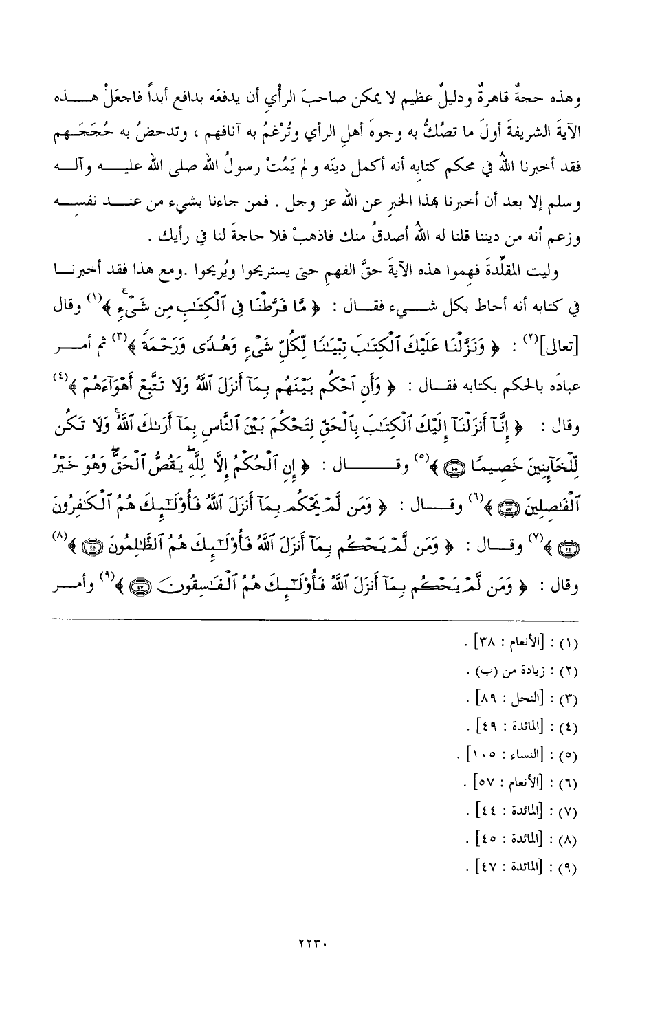 وليت المقلدة فهموا هذا الآية حق الفهم حتى يستريحوا ويُريحوا. ومع هذا فقد أخبرنا في كتابه أنه أحاط بكل شيء فقال: {ما فرطنا في الكتاب من شيء} (¬1) وقال: [تعالى] (¬2): {ونزلنا عليك الكتاب تبيانًا لكل شيء وهدى ورحمة} (¬3) ثم أمر عباده بالحكم بكتابه فقال: {وأن أحكم بينهم بما أنزل الله ولا تتبع أهواءهم} (¬4) وقال: {إنا أنزلنا إليك الكتاب بالحق لتحكم بين الناس بما أراك الله ولا تكن للخائنين خصيمًا} (¬5) وقال: {إن الحكم إلا لله يقص الحق وهو خيبر الفاصلين} (¬6) وقال: {ومن لم يحكم بما أنزل الله فأولئك هم الكافرون} (¬7) وقال: {ومن لم يحكم بما أنزل الله فأولئك هم الظالمون} (¬8) وقال: {ومن لم يحكم بما أنزل الله فأولئك هم الفاسقون} (¬9) وأمر