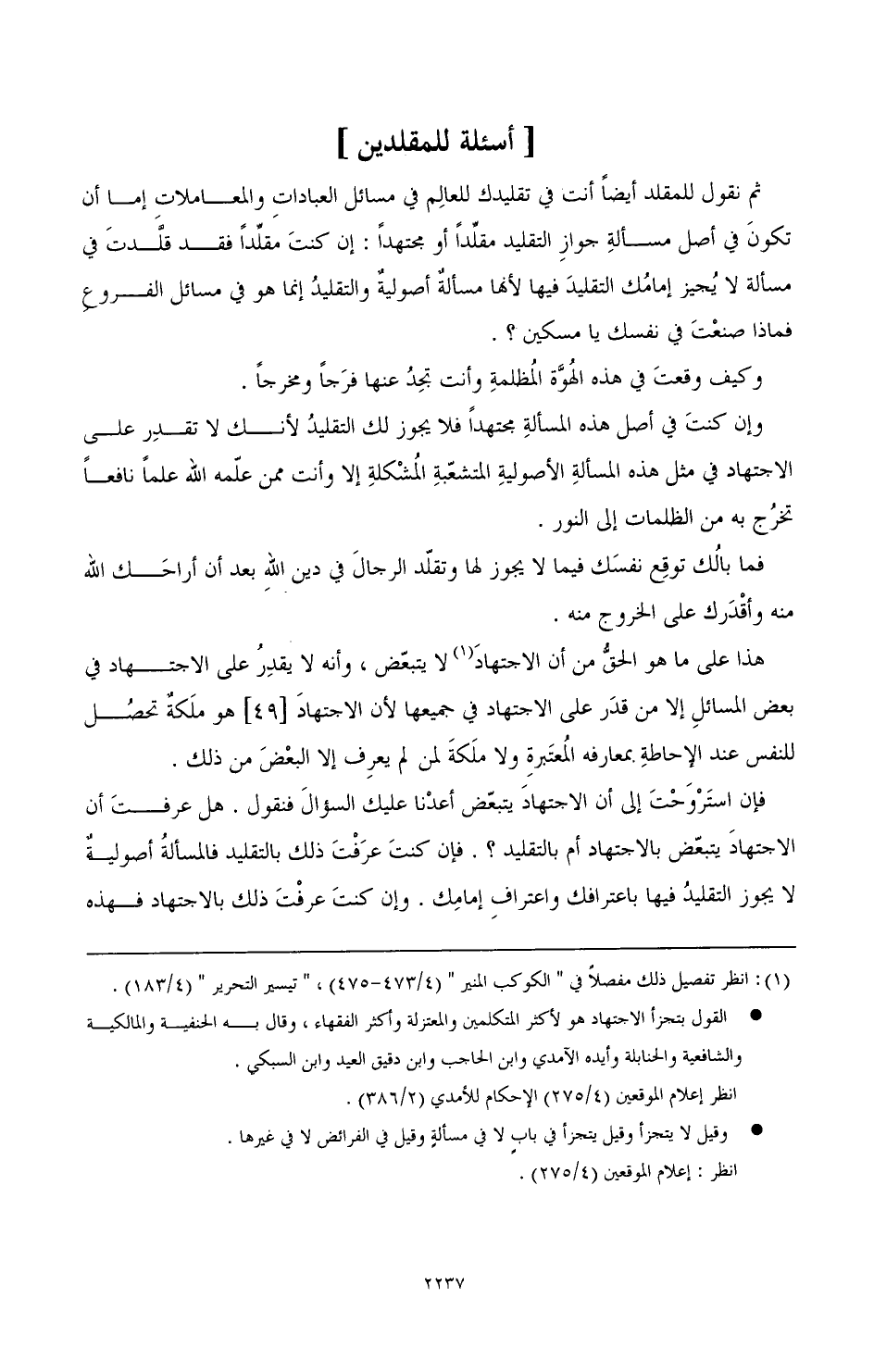 وإن كنت في أصل هذه المسألة مجتهدًا فلا يجوز لك التقليد لأنك لا تقدر على الاجتهاد في مثل هذه المسألة الأصولية المتشعبة المشكلة إلا وأنت ممن علّمه الله علمًا نافعًا تخرج به من الظلمات إلى النور.