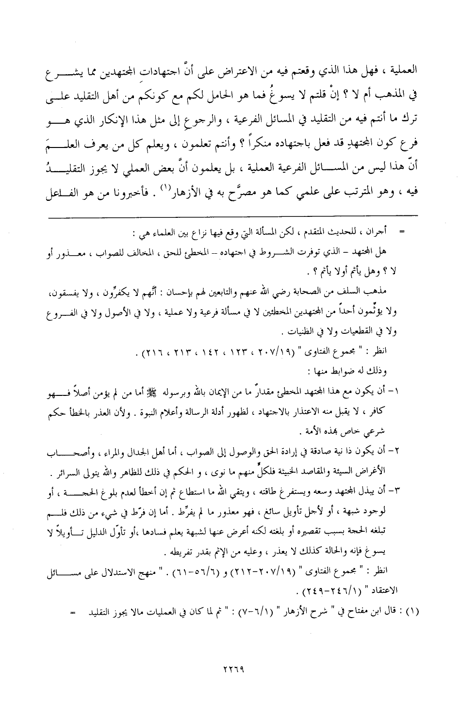 العملية، فهل هذا الذي وقعتم فيه من الاعتراض على أن اجتهادات المجتهدين مما يشرع في المذهب أم لا؟ إن قلتم لا يسوغ فما هو الحامل لكم مع كونكم من أهل التقليد على ترك ما أنتم فيه من التقليد في المسائل الفرعية، والرجوع إلى مثل هذا الإنكار الذي هو فرع كون المجتهد قد فعل باجتهاده منكرًا؟ وأنتم تعلمون، ويعلم كل من يعرف العلم أنّ هذا ليس من المسائل الفرعية العلمية، بل يعلمون أن بعض العملي لا يجوز التقليد فيه، وهو المترتب على علمي كما هو مصرّح به في الأزهار (¬1). فأخبرونا من هو الفاعل