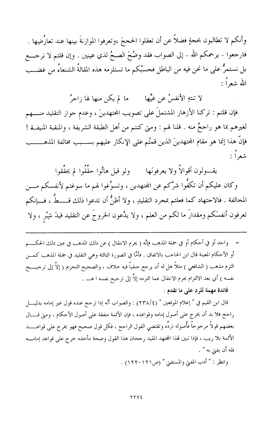 وكان عليكم أن تكفوا شركم عن المجتهدين، وتسوغِّوا لهم ما سوغتم لأنفسكم من المخالفة. فالاجتهاد كما فعلتم بمجرد التقليد، ولا أظن أن تدعوا ذلك قط، فإنكم تعرفون أنفسكم ومقدار ما لكم من العلم، ولا يدعون الخروج عن التقليد قيد شبر، ولا