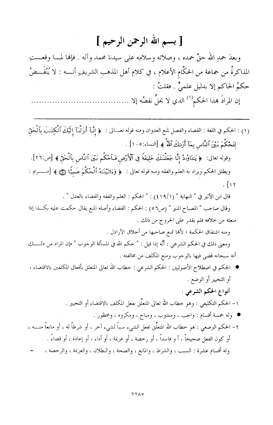 (¬1) الحكم في اللغة: القضاء والفصل لمنع العدوان ومنه قوله تعالى: {إنا أنزلنا إليك الكتاب بالحق لتحكم بين الناس بما أراك الله} [النساء: 105].