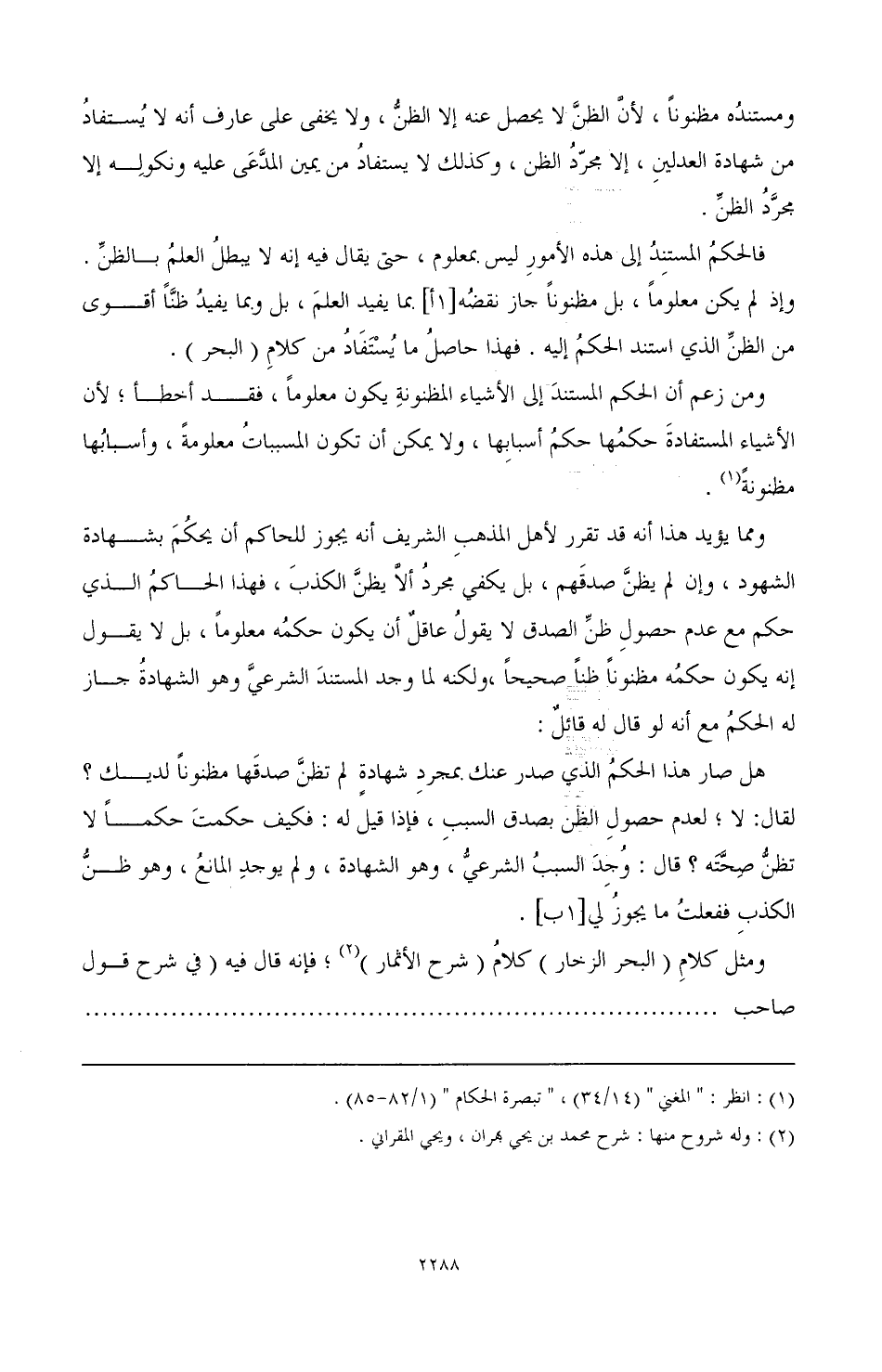 ومن زعم أن الحكم المستند إلى الأشياء المظنونة يكون معلومًا، فقد أخطأ؛ لأن الأشياء المستفادة حكمها حكم أسبابها، ولا يمكن أن تكون المسببات معلومة، وأسبابها مظنونة (¬1). ومما يؤيد هذا أنه قد تقرر لأهل المذهب الشريف أنه يجوز للحاكم أن يحكم بشهادة الشهود، وإن لم يظن صدقهم، بل يكفي مجرد ألا يظن الكذب، فهذا الحاكم الذي حكم مع عدم حصول ظنِّ الصدق لا يقول عاقل أن يكون حكمه معلومًا، بل لا يقول إنه يكون حكمه مظنونًا ظنًا صحيحًا، ولكنه لما وجد المستند الشرعي وهو الشهادة جاز له الحكم مع أنه لو قال له قائل: