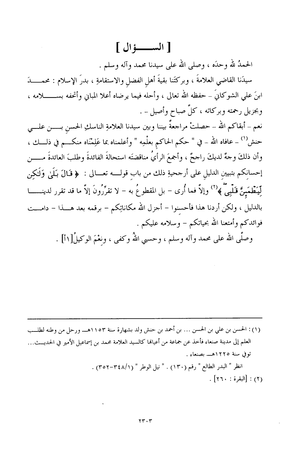 نعم - أبقاكم الله- حصلت مراجعة بيننا وبين سيدنا العلامة الناسك الحسن بن علي حنش (¬1) -عافاه الله- في «حكم الحاكم بعلمه» وأعلمناه بما علمناه منكم في ذلك، وأن ذلك وجه لديك راجحٌ، وأجمع الرأي مناقضته استحالة الفائدة وطلب العائدة من إحسانكم بتبيين الدليل على أرجحية ذلك من باب قوله تعالى: {قال بلى ولكن ليطمئن قلبي} (¬2) وإلا فما أرى - بل المقطوع به- لا تقررون إلا ما قد تقرر لدينا بالدليل، ولكن أردنا هذا فأحسنوا - أجزل الله مكاناتكم- برقمه بعد هذا- دامت فوائدكم وأمتعنا الله بحياتكم- وسلامه عليكم.