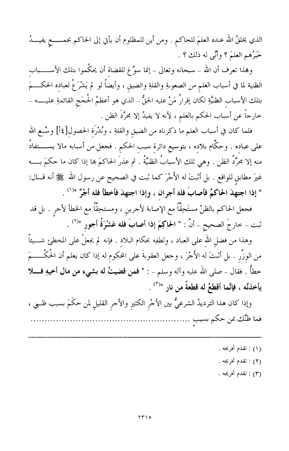 فلما كان في أسباب العلم ما ذكرناه من الضيق والقلة، وندرة الحصول [4أ] وسع الله على عباده. وحكام بلاده، بتوسيع دائرة سبب الحكم. فجعل من أسبابه مالاً يستفاد منه إلا مجرد الظن. وهي تلك الأسباب الظنية. ثم عذر الحاكم بها إذا كان ما حكم به غير مطابق للواقع. بل أثبت له الأجر كما ثبت في الصحيح عن رسول الله صَلَّى اللهُ عَلَيْهِ وَسَلَّمَ أنه قال: «إذا اجتهد الحاكم فأصاب فله أجران، وإذا اجتهد فأخطأ فله أجر» (¬1).