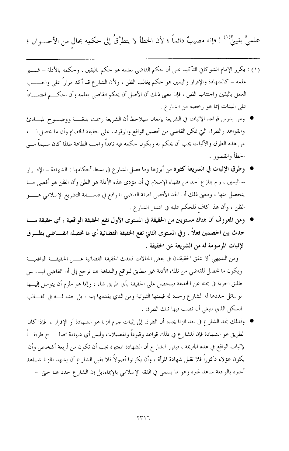 (¬1) يكرر الإمام الشوكاني التأكيد على أن حكم القاضي بعلمه هو حكم اليقين، وحكمه بالأدلة - غير علمه - كالشهادة والإقرار واليمين هو حكم يغالب الظن، ولأن الشارع قد أكد مرارًا على واجب العمل باليقين واجتناب الظن، فإن معنى ذلك أن الأصل أن يحكم القاضي بعلمه وأن الحكم اعتمادًا على البينات إنما هو رخصة من الشارع.