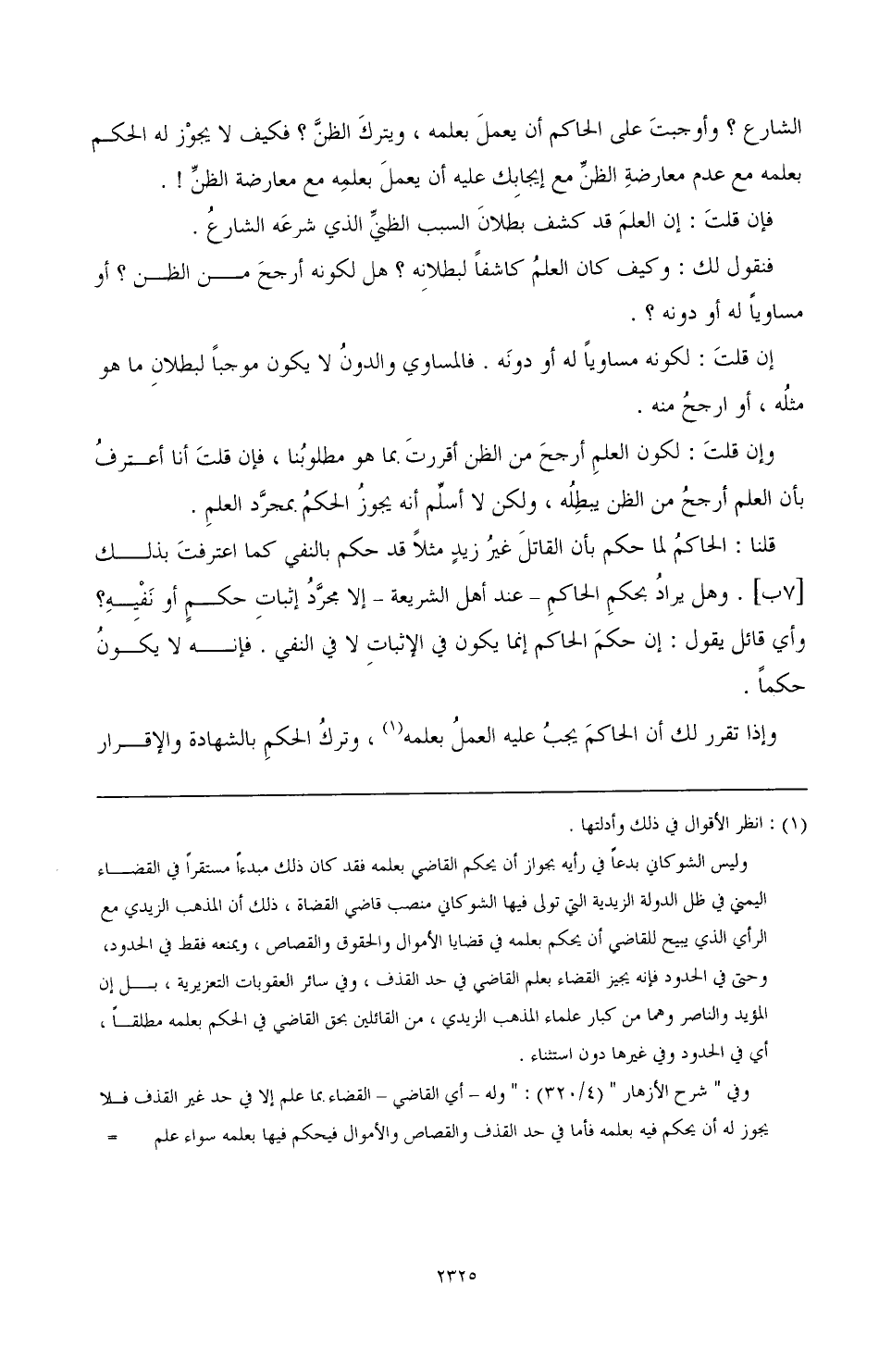 الشارع؟ وأوجبت على الحاكم أن يعمل بعلمه، ويترك الظن؟ فكيف لا يجوز له الحكم بعلمه مع عدم معارضة الظن مع إيجابك عليه أن يعمل بعلمه مع معارضة الظن!.