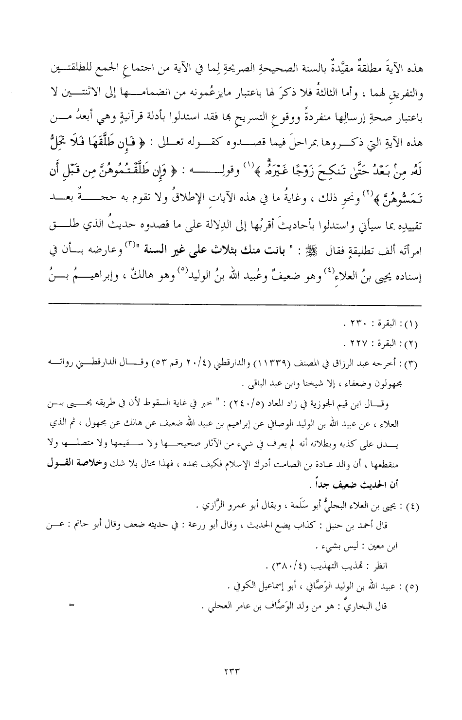 هذه الآية مطلقة مقيدة بالسنة الصحيحة الصريحة لما في الآية من اجتماع الجمع للطلقتين والتفريق لهما، وأما الثالثة فلا ذكر لها باعتبار ما يزعمونه من انضمامها إلى الاثنتين لا باعتبار صحة إرسالها منفردة ووقوع التسريح بها، فقد استدلوا بأدلة قرآنية، وهي أبعد من هذه الآية التي ذكروها بمراحل فيما قصدوه كقوله تعالى: {فَإِنْ طَلَّقَهَا فَلَا تَحِلُّ لَهُ مِنْ بَعْدُ حَتَّى تَنْكِحَ زَوْجًا غَيْرَهُ} (¬1) وقوله: {وإن طلقتموهن من قبل أن تمسوهن} (¬2) ونحو ذلك. وغاية ما في هذه الآيات الإطلاق، ولا تقوم به حجة بعد تقييده بما سيأتي، واستدلوا بأحاديث أقربها إلى الدلالة على ما قصدوه حديث الذي طلق امرأته ألف تطليقة، فقال صَلَّى اللهُ عَلَيْهِ وَسَلَّمَ: "بانت منك بثلاث على غير السنة" (¬3) وعارضه بأن في إسناده يحيى بن العلاء (¬4) وهو ضعيف وعبيد الله بن الوليد (¬5) وهو هالك، وإبراهيم بن