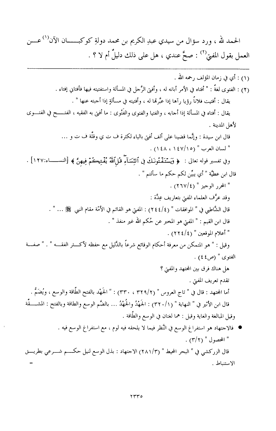 الحمد لله، ورد سؤال من سيدي عبد الكريم بن محمد دولة كوكبان الآن (¬1) عن العمل بقول المفتي (¬2): صح عندي، هل على ذلك دليل أم لا؟
