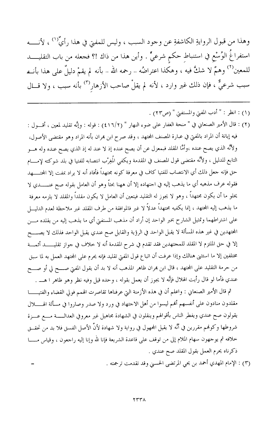 وهذا من قبول الرواية الكاشفة عن وجود السبب، وليس للمفتي في هذا رأي (¬1)، لأه استفراغ الوسع في استنباط حكم شرعي. وأين هذا ممن ذاك!؟ فجعله من باب التقليد للمعين (¬2) وهم لا شك فيه، وهكذا اعتراضه - رحمه الله- بأنه لم يقم دليل على هذا بأنه سبب شرعي، فإن ذلك غير وارد، لأنه لم يقل صاحب الأزهار (¬3) بأنه سبب، ولا قال