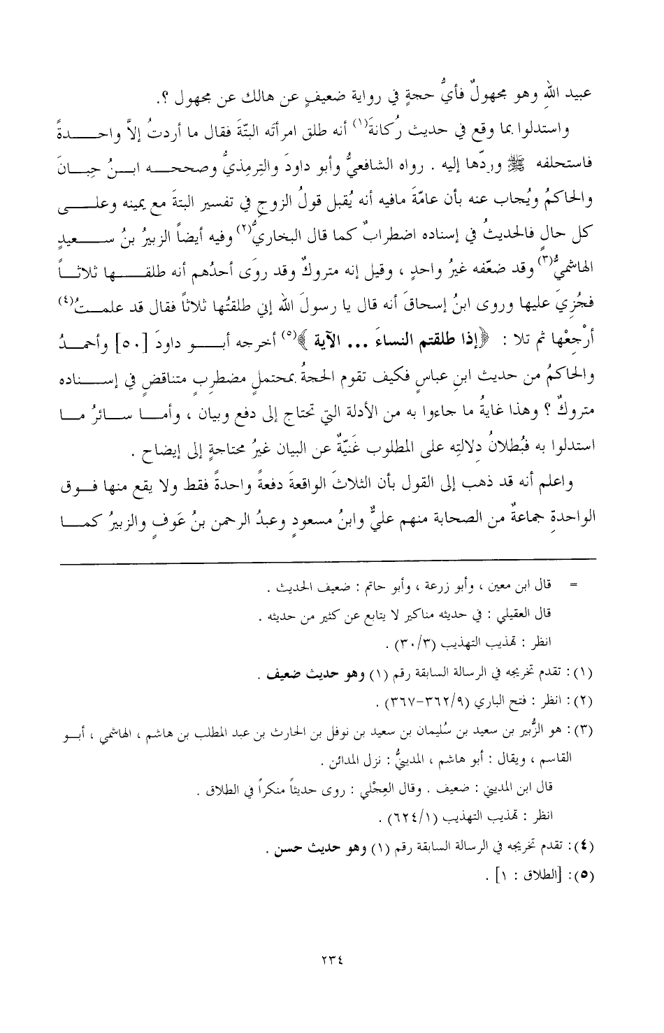 واستدلوا بما وقع في حديث ركانة (¬1) أنه طلق امرأته البتة فقال: ما أردت إلا واحدة فاستحلفه صَلَّى اللهُ عَلَيْهِ وَسَلَّمَ وردها إليه. رواه الشافعي وأبو داود والترمذي وصححه ابن حبان والحاكم. ويجاب عنه بأن عامة ما فيه أنه يقبل قول الزوج في تفسير ألبتة مع يمينه وعلى كل حال فالحديث في إسناده اضطراب كما قال البخاري (¬2) وفيه أيضًا الزبير بن سعيد الهاشمي (¬3) وقد ضعفه غير واحد، وقيل: إنه متروك. وقد روى أحدهم أنه طلقها ثلاثا فجزي عليها، وروى ابن إسحاق أنه قال: يا رسول الله إني طلقتها ثلاثا فقال: قد علمت (¬4) أرجعها ثم تلا: {إذا طلقتم النساء ... الآية} (¬5) أخرجه أبو داود [50] وأحمد والحاكم من حديث ابن عباس فكيف تقوم الحجة بمحتمل مضطرب متناقض في إسناده متروك؟ وهذا غاية ما جاءوا به من الأدلة التي تحتاج إلى دفع وبيان، وأما سائر ما استدلوا به فبطلان دلالته على المطلوب غنية عن البيان غير محتاجة إلى إيضاح.
