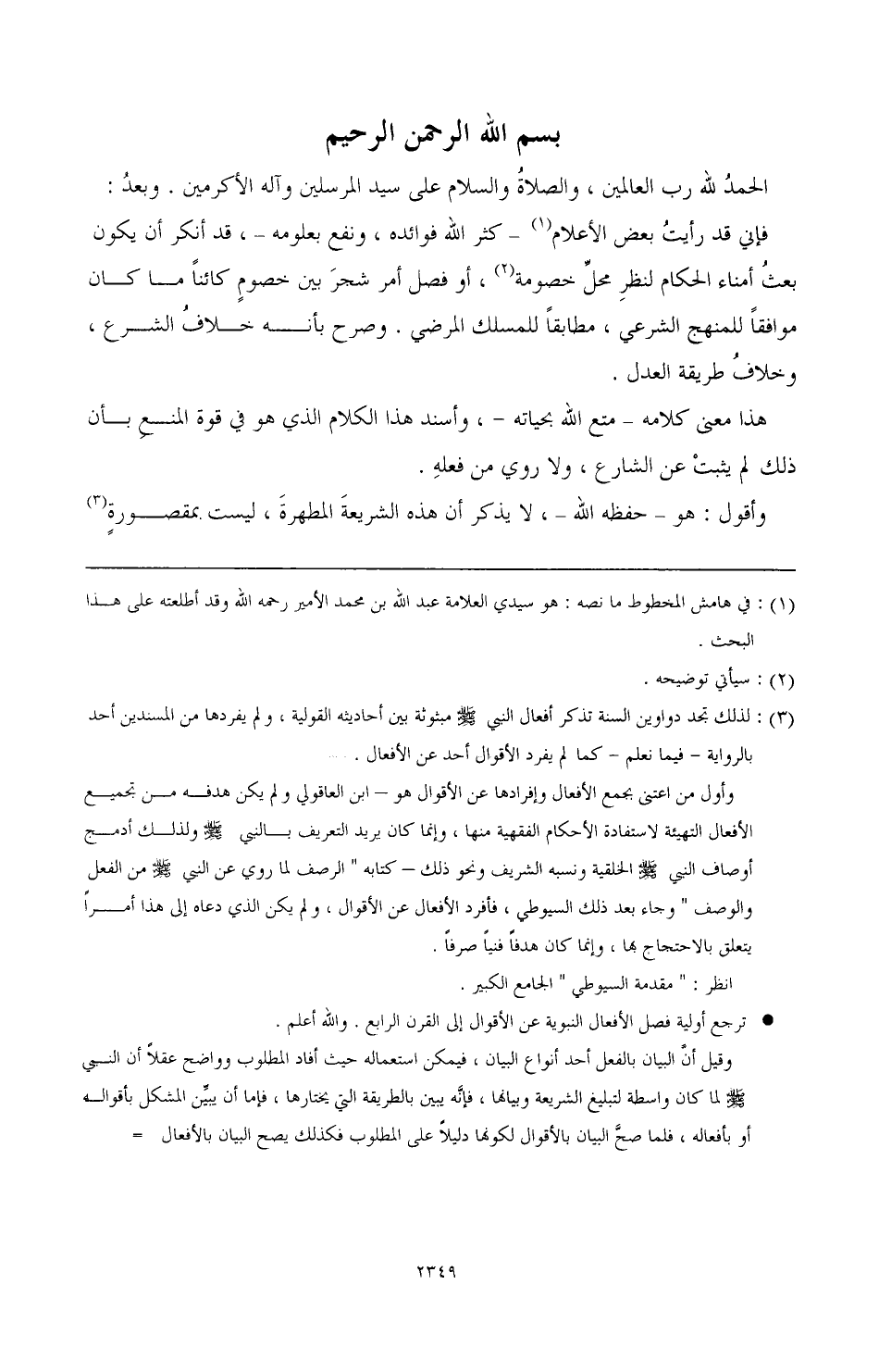 وأول من اعتنى بجمع الأفعال وإفرادها عن الأقوال هو- ابن العاقولي ولم يكن هذفه من تجميع الأفعال التهيئة لاستفاد الأحكام الفقهية منها، وإنما كان يريد التعريف بالنبي صَلَّى اللهُ عَلَيْهِ وَسَلَّمَ ولذلك أدمج أوصاف النبي صَلَّى اللهُ عَلَيْهِ وَسَلَّمَ الخلقية ونسبه الشريف ونحو ذلك- كتابه «الرصف لما روي عن النبي صَلَّى اللهُ عَلَيْهِ وَسَلَّمَ من الفعل والوصف» وجاء بعد ذلك السيوطي، فأفرد الأفعال عن الأقوال، ولم يكن الذي دعاه إلى هذا أمرًا يتعلق بالاحتجاج بها، وإنما كان هدفًا صرفًا.