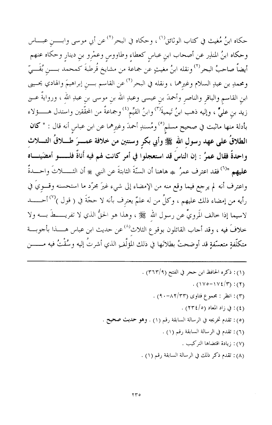 حكاه ابن مغيث في كتاب الوثائق (¬1)، وحكاه في البحر (¬2) عن أبي موسى وابن عباس، وحكاه ابن المنذر عن أصحاب ابن عباس كعطاء وطاوس وعمرو بن دينار وحكاه عنهم أيضًا صاحب البحر (¬3) ونقله ابن مغيث عن جماعة من مشايخ قرطبة كمحمد بن بقي، ومحمد بن عبد السلام وغيرهما، ونقله في البحر (¬4) عن القاسم بن إبراهيم، والهادي يحيى بن القاسم، والباقر والناصر، وأحمد بن عيسى، وعبد الله بن موسى بن عبد الله، ورواية عن زيد بن علي، وإليه ذهب ابن تيمية (¬5) وابن القيم (¬6) وجماعة من المحققين. واستدل هؤلاء بأدلة منها ما ثبت في صحيح مسلم (¬7) ومسند أحمد وغيرهما عن ابن عباس أنه قال: "كان الطلاق على عهد رسول الله صَلَّى اللهُ عَلَيْهِ وَسَلَّمَ وأبي بكر وسنتين من خلافة عمر طلاق الثلاث واحدة، فقال عمر: إن الناس قد استعجلوا في أمر كانت لهم فيه أناة فلو أمضيناه عليهم" (¬8) فقد اعترف عمر رضي الله عنه هاهنا أن السنة الثابتة عن النبي صَلَّى اللهُ عَلَيْهِ وَسَلَّمَ أن الثلاث واحدة، واعترف أنه لم يرجع فيما وقع منه من الإمضاء إلى شيء غير مجرد ما استحسنه وقوي في رأيه من إمضاء ذلك عليهم، وكل من له علم يعترف بأنه لا حجة في (قول) (¬9) أحد لا سيما إذا خالف المروي عن رسول الله صَلَّى اللهُ عَلَيْهِ وَسَلَّمَ، وهذا هو الحق الذي لا تفريط به ولا خلاف فيه. وقد أجاب القائلون بوقوع الثلاث (¬10) عن حديث ابن عباس هذا بأجوبة متكلفة متعسفة قد أوضحت بطلانها في ذلك المؤلف الذي أشرت إليه وسقت فيه من