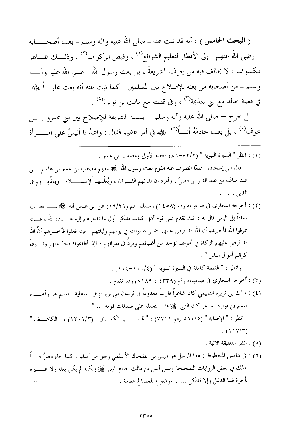 (البحث الخامس): أنه قد ثبت عنه- صَلَّى اللهُ عَلَيْهِ وَآلِهِ وَسَلَّمَ- بعث أصحابه- رضي الله عنهم- إلى الأقطار لتعليم الشرائع (¬1)، وقبض الزكوات (¬2). وذلك ظاهر مكشوف، لا يخالف فيه من يعرف الشريعة، بل بعث رسول الله- صَلَّى اللهُ عَلَيْهِ وَآلِهِ وَسَلَّمَ- من اصحابه من بعثه للإصلاح بين المسلمين. كما ثبت عنه أنه بعث عليًا رضي الله عنه في قصة خالد مه بني جذيمة (¬3)، وفي قصته مع مالك بن نويرة (¬4). بل خرج- صَلَّى اللهُ عَلَيْهِ وَآلِهِ وَسَلَّمَ- بنفسه الشريفة للإصلاح بين بني عمرو بن عوف (¬5)، بل بعث خادمة أنيسًا (¬6) رضي الله عنه في أمر عظيم فقال: واغد يا أنيس على امرأة