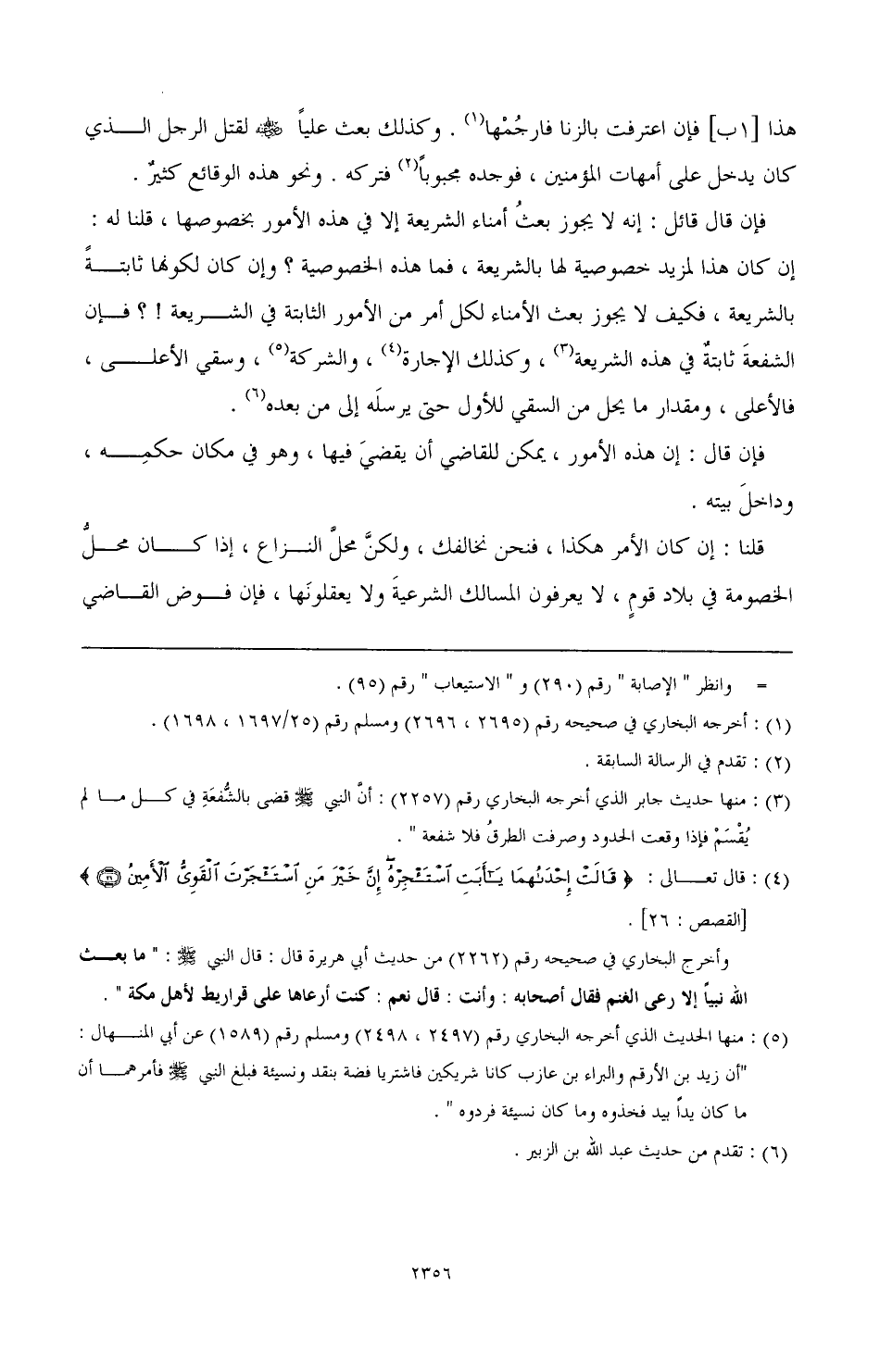 فإن قال قائل: إنه لا يجوز بعث أمناء الشريعة إلا في هذه الأمور بخصوصها، قلنا له: إن كان هذا لمزيد خصوصية لها الشريعة، فما هذه الخصوصية؟ وإن كان لكونها ثابتة بالشريعة، فكيف لا يجوز بعث الأمناء لكل أمر من الأمور الثايتة في الشبريعة!؟ فإن الشفعة ثابتة في هذه الشريعة (¬3)، وكذلك الإجارو (¬4)، والشركة (¬5)، وسقي الأعلى، فالأعلى، ومقدار ما يحل من السقي للأول حتى يرسله إلى من بعده (¬6).