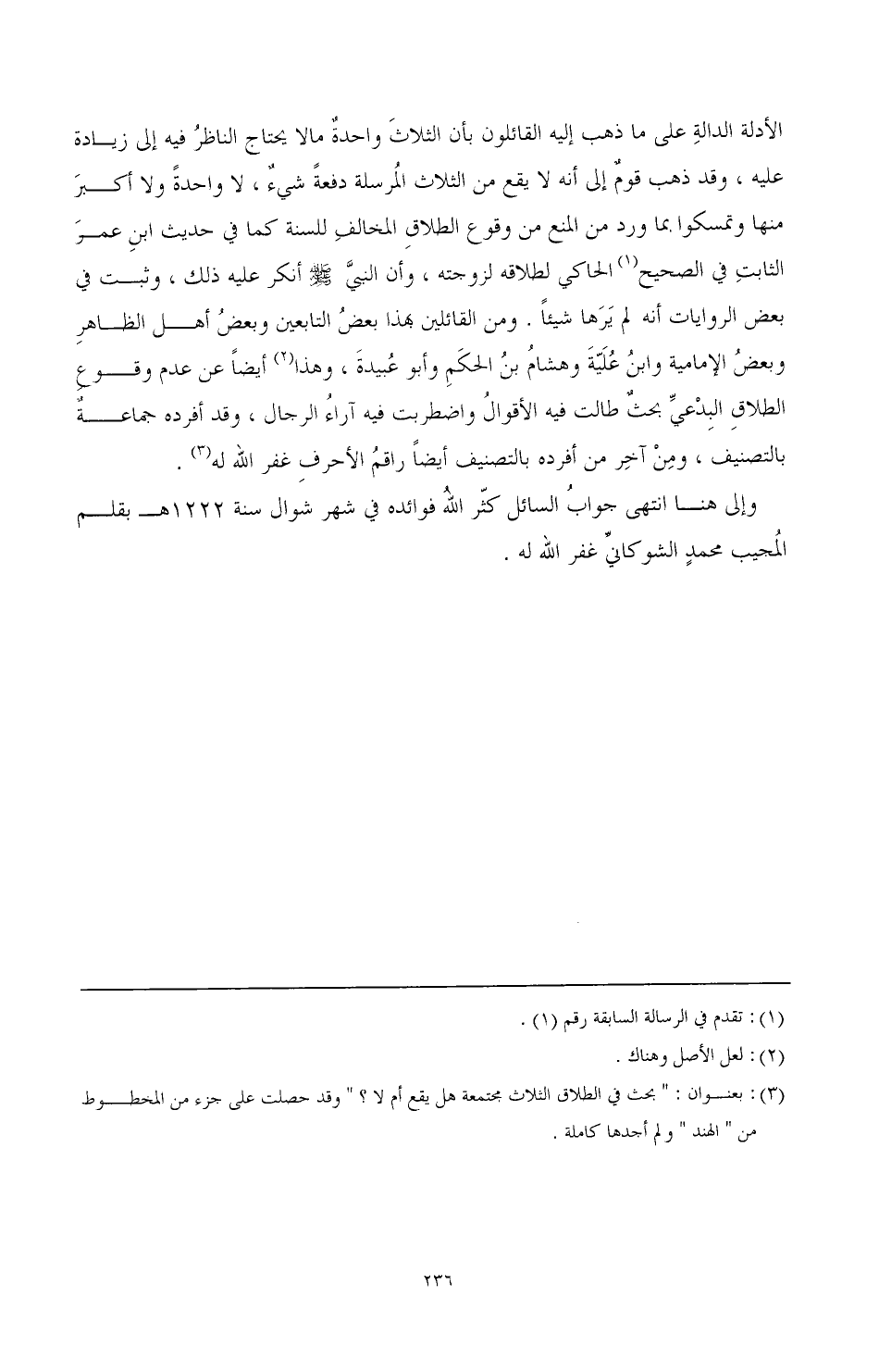 (¬3) بعنوان: "بحث في الطلاق الثلاث مجتمعة هل يقع أم لا؟ وقد حصلت على جزء من المخطوط من " الهند " ولم أجدها كاملة.