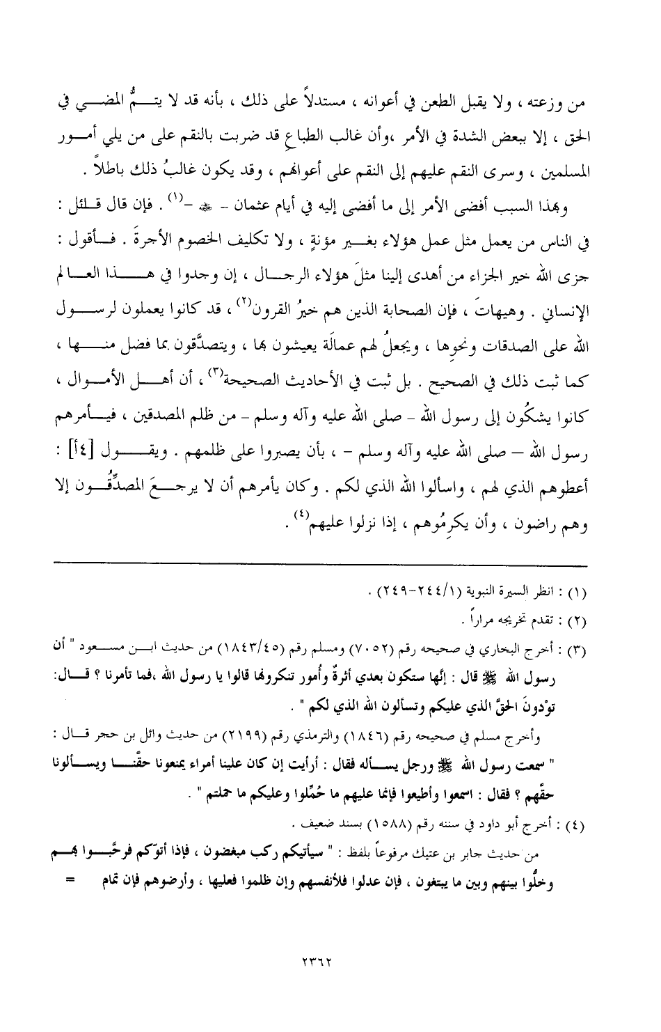 وأخرج مسلم في صحيحه رقم (1846) والترمذي رقم (2199) من حديث وائل بن حجر قال: «سمعت رسول الله صَلَّى اللهُ عَلَيْهِ وَسَلَّمَ ورجل يسأله فقال: أرأيت إن كان علينا أمراء يمنعون حقنا ويسألونا حقهم؟ فقال اسمعوا وأطيعوا فإنما عليهم ما حملوا وعليكم ما حملتم».%، أن أهل الأموال، كانوا يشكون إلى رسول الله- صَلَّى اللهُ عَلَيْهِ وَآلِهِ وَسَلَّمَ- من ظلم المصدقين، فيأمرهم رسول الله- صَلَّى اللهُ عَلَيْهِ وَآلِهِ وَسَلَّمَ-، بأن يصيروا على ظلمهم. ويقول [4 أ]: أعطوهم الذي لهم، واسألوا الله الذي لكم. وكان يأمرهم أن لا يرجع المصدقون إلا وهم راضون، وأن يكرموهم، إذا نزلوا عليهم