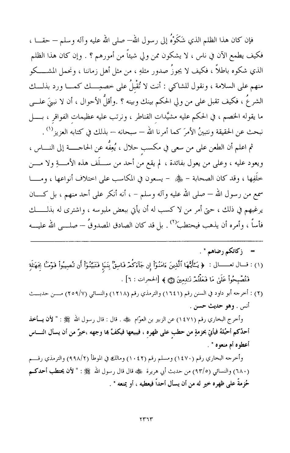 ثم اعلم أن الطعن على من سعى في مكسب حلال، يعفه عن الحاجة إلى الناس، ويعود عليه، وعلى من يعول بفائدة لم يقع أحد من سلف هذه الأمة ولا من خلفها، وقد كان الصحابة- رضي الله عنهم- يسعون في المكاسب على اختلاف أنواعها، ما سمع من رسول الله- صَلَّى اللهُ عَلَيْهِ وَآلِهِ وَسَلَّمَ-، أنه أنكر على أحد منهم، بل كان يرغبهم في ذلك، حتى أمر من لا كسب له أن يأتي ببعض ملبوسه، واشترى له بذلك فأسًا، وأمره أن يذهب فيحتطب