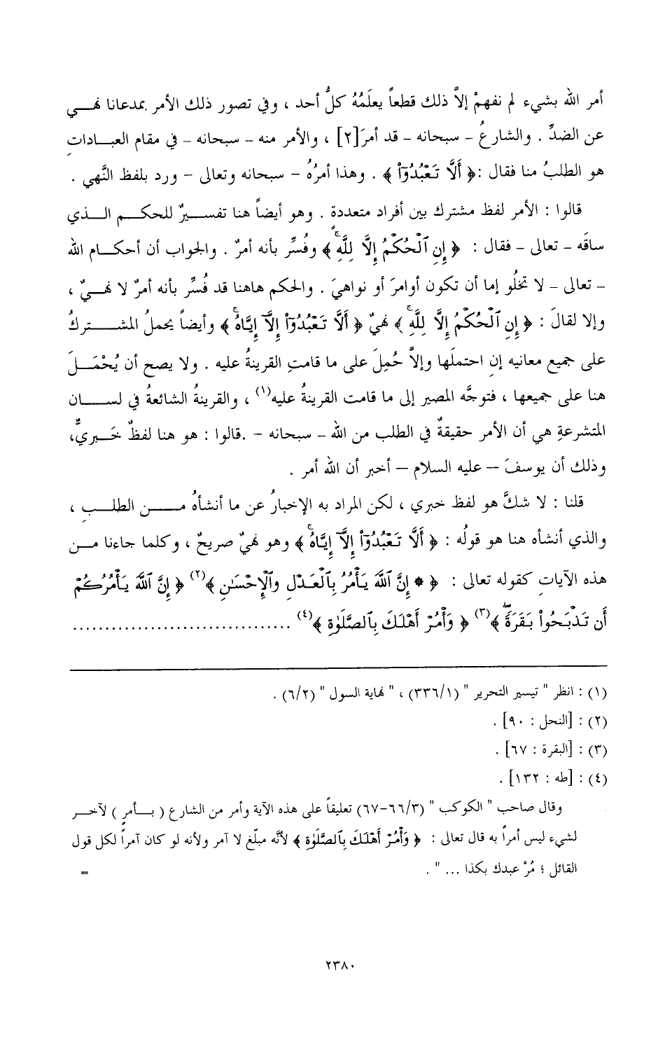(¬1) انظر: «تيسير التحرير» (1/ 336)، «نهاية السول» (2/ 6).%، والقرينة الشائعة في السان المتشرعة هي أن الأمر حقيقة في الطلب من الله- سبحانه- قالوا: هو هنا لفظ خبري، وذلك أن يوسف- عليه السلام- أخبر أن الله أمر.