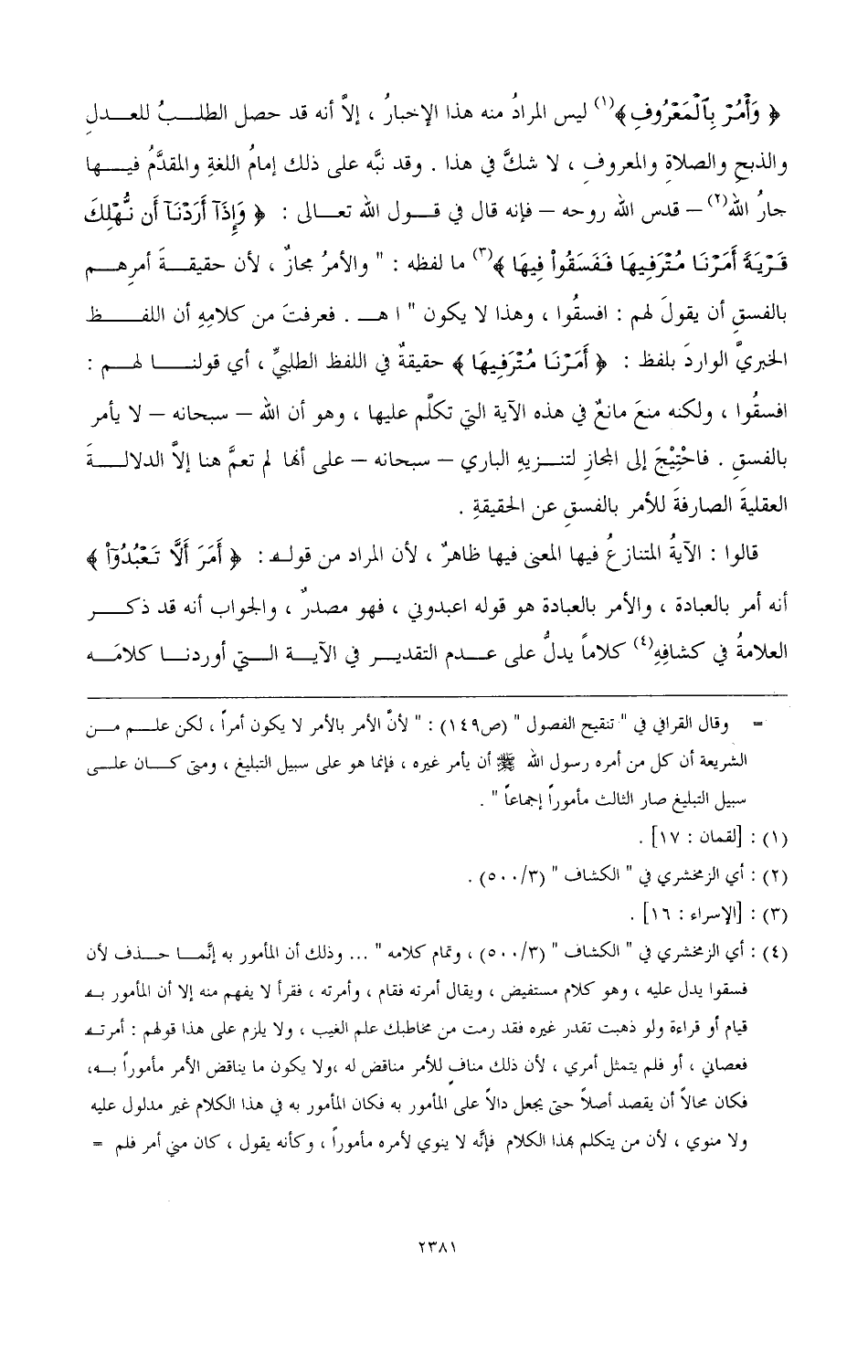 {وأمر بالمعروف} (¬1) أي الزمخشري في «الكشاف» (3/ 500).%- قدس الله روحه- فإنه قال في قوله تعالى: {وإذا أردنا أن نهلك قرية أمرنا مترفيها ففسقوا فيها} (¬2) أي الزمخشري في «الكشاف» (3/ 500)، وتمام كلامه» ... وذلك أن المأمور به إنما حذف لأن فسقوا يدل عليه، وهو كلام مستفيض، ويقال أمرته فقام، وأمرته، فقرأ لا يفهم منها إلا أن المأمور به قيام أو قراءة ولو ذهبت تقدر غيره فقد رمت من مخاطبك علم الغيب، ولا يلزم على هذا قولهم: أمرته فعصاني، أو فلم يتمثل أمري؛ لأن ذلك مناف للأمر مناقض له، ولا يكون ما يناقض الأمر مأمورًا به، فكان محالاً أن يقصد أصلاً حتى يجعل دالاً على المأمور به فكان المأمور به في هذا الكلام غير مدلول عليه ولا منوي؛ لأن من يتكلم بهذا الكلام فإنه لا ينوي لأمره مأمورًا، وكأنه يقول، كان مني أمر فلم تكن منه طاعة، كما أن من يقول فلان يعطي ويمنع ويأمر وينهي، غير قاصد إلى مفعول به.% كلامًا يدل على عدم التقدير في الآية التي أوردنا كلامه