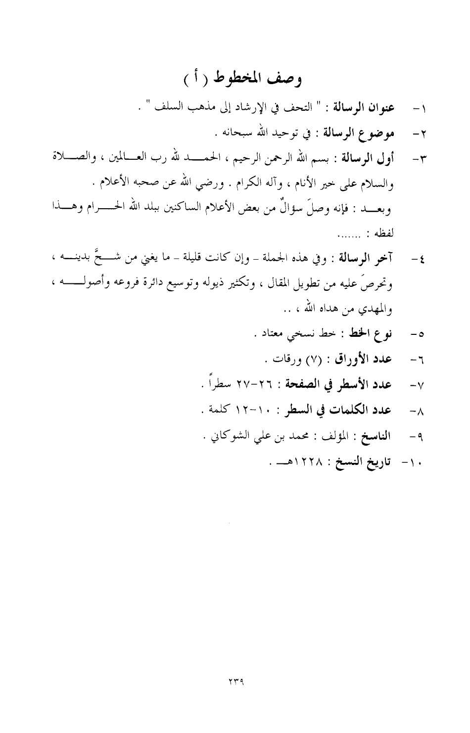 1 - عنوان الرسالة: " التحف في الإرشاد إلى مذهب السلف ".
