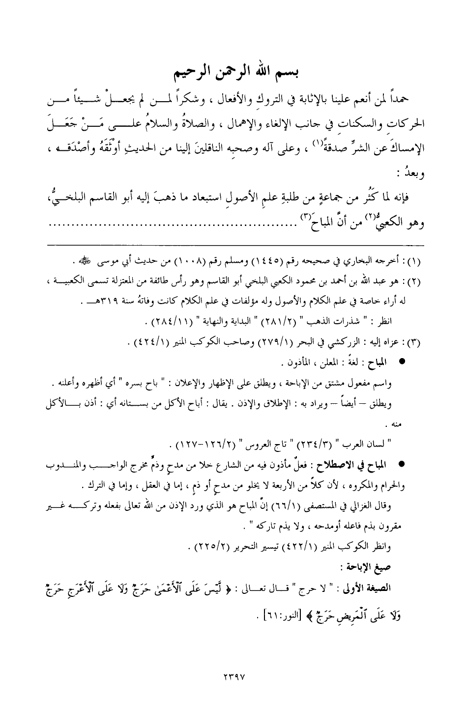 فإنه لما كثر من جماعة من طلبة علم الأصول استبعاد ما ذهب إليه أبو القاسم البلخي وهو الكعبي (¬2) من أن المباح (¬3) ...................