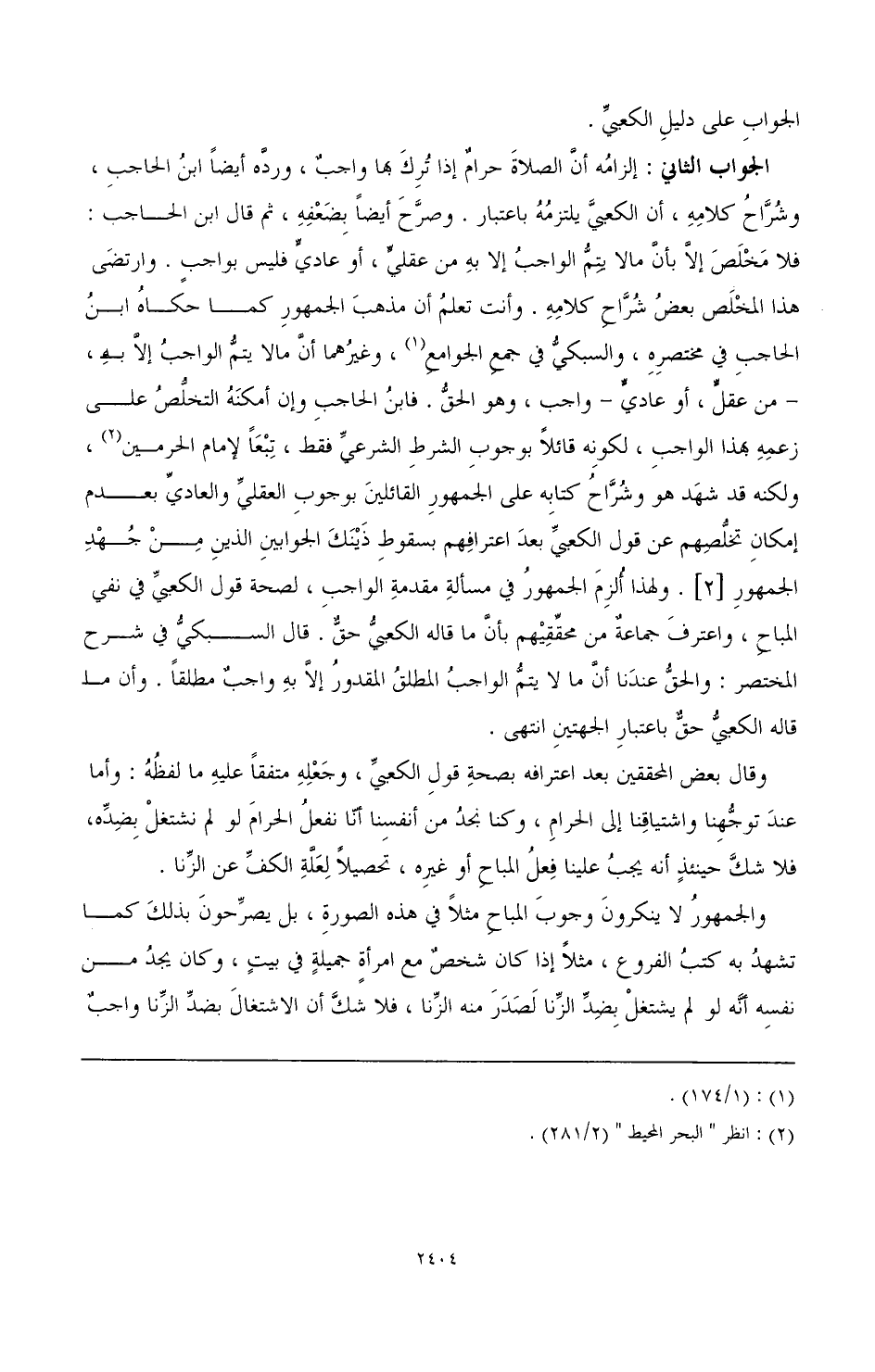 الجواب الثاني: إلزامه أن الصلاة حرام إذا ترك بها واجب، ورده أيضًا ابن الحاجب وشراح كلمة، أن الكعبي يلتزمه باعتبار. وصرح أيضًا بضعفه، ثم قال ابن الحاجب: فلا مخلص إلا بأن ما لا يتم الواجب إلا به من عقلي، أو عادي فليس بواجب. وارتضى هذا المخلص بعض شراح كلامه. وأنت تعلم أن مذهب الجمهور كم حكاه ابن الحاجب في مختصره، والسبكي في جمع الجومع (¬1) انظر «البحر المحيط» (2/ 281).%، ولكنه قد شهد هو وشراح كتابه على الجمهور القائلين بوجوب العقلي والعادي بعدم إمكان تخلصهم عن قول الكعبي بعد اعترافهم بسقوط ذينك الجوابين الذين من جهد الجمهور [2]. ولهذا ألزم الجمهور في مسألة مقدمة الواجب؛ لصحة قول الكعبي في نفي المباح، واعترف جماعة من محققهم بأن ما قاله الكعبي حق. قال السبكي في شرح المختصر: والحق عندنا أن ما لا يتم الواجب المطلق المقدور إلا به واجب مطلقًا. وأن ما قاله الكعبي حق باعتبار الجهتين انتهى.