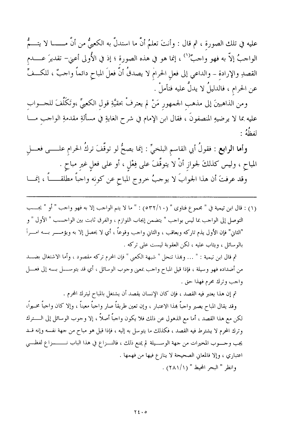 وأما الرابع: فقول أبي القاسم البلخي: إنما يصح لو توقف ترك الحرام على فعل المباح، وليس كذلك لجواز أن لا يتوقف على فعل، أو على فعل غير مباح.