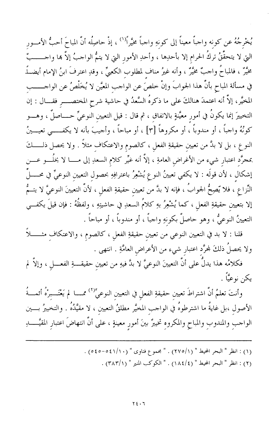(¬1) انظر «البحر المحيط» (1/ 275). «مجموع فتاوى» (10/ 541 - 545).%، إذ حاصله أن المباح أحب الأمور التي لا يتحقق ترك الحرام إلا بأحدها، وأحد الأمور التي لا يتم الواجب إلا بها واجب مخير، فالمباح واجب مخير، وأنه غير مناف لمطلوب الكعبي، وقد اعترف ابن الإمام أيضًا في مسألة المباح بأن هذا الجواب وإن خلص عن الواجب المعين لا يخلص عن الواجب المخير، إلا أنه اعتمد هنالك على ما ذكره السعد في حاشية شرح المختصر فقال: إن التخيير إنما يكون في أمور معينة بالاتفاق، ثم قال: قيل التعيين النوعي حاصل، وهو كونه واجبًا، أو مندوبًا، أو مكروهًا [3]، أو مباحًا، وأجيب بأنه لا يكفي تعيين النوع، بل لا بد من تعيين حقيقة الفعل، كالصوم والاعتكاف مثلاً. ولا يحصل ذلك بمجرد اعتبار شيء من الأغراض العامة، إلا أنه غير كلام السعد إلى ما لا يخلو عن إشكال؛ لأن قوله: لا يكفي تعيين النوع يشعر باعترافه بحصول التعيين النوعي في محل النزاع، فلا يصح الجواب، فإنه لا بد من تعيين حقيقة الفعل؛ لأن التعيين النوعي لا يتم إلا بتعيين حقيقة الفعل، كما يشعر به كلام السعد في حاشيته، ولفظه: فإن قيل يكفي التعيين النوعي، وهو حاصل بكونه واجبًا، أو مندوبًا، أو مباحًا.