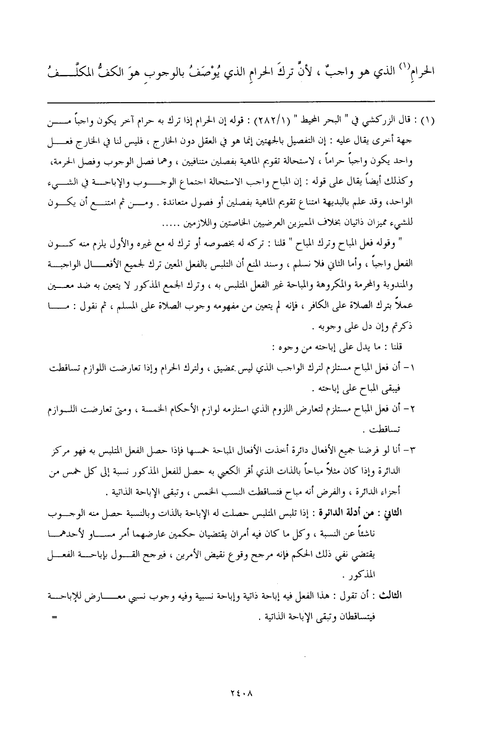 (¬1) قال الزركشي في «البحر المحيط» (1/ 282): قوله إن الحرام إذا ترك به حرام آخر يكون واجبًا من جهة أخرى يقال عليه: إن التفصيل بالجهتين إنما هو في العقل دون الخارج، فليس لنا في الخرج فعل وحد يكون واجبًا حرامًا؛ لاستحالة تقويم الماهية بفصلين متنافيين، وهما فصل الوجوب وفصل الحرمة، وكذلك أيضًا يقال على قوله: إن المباح واجب الاستحالة اجتماع الوجوب والإباحة في الشيء الواحد، وقد علم بالبديهة امتناع تقويم الماهية بفصلين أو فصول متعاندة. ومن ثم امتنع أن يكون للشيء مميزان ذاتيان بخلاف المميزين العرضيين الخاصتين واللازمين ..