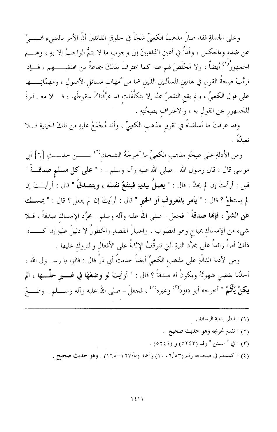 ومن الأدلة الدالة على مذهب الكعبي أيضًا حديث أبي ذر قال: «قالوا يا رسول الله، أحدنا يقضي شهوته ويكون له صدقة؟ قال: أرأيت لو وضعها في غير حلها، ألم يكن يأثم» أخرجه أبو داود (¬2) كمسلم في صحيحه رقم (53/ 1006) وأحمد (5/ 167 - 168). وهو حديث صحيح.%، فجعل- صَلَّى اللهُ عَلَيْهِ وَآلِهِ وَسَلَّمَ- وضع