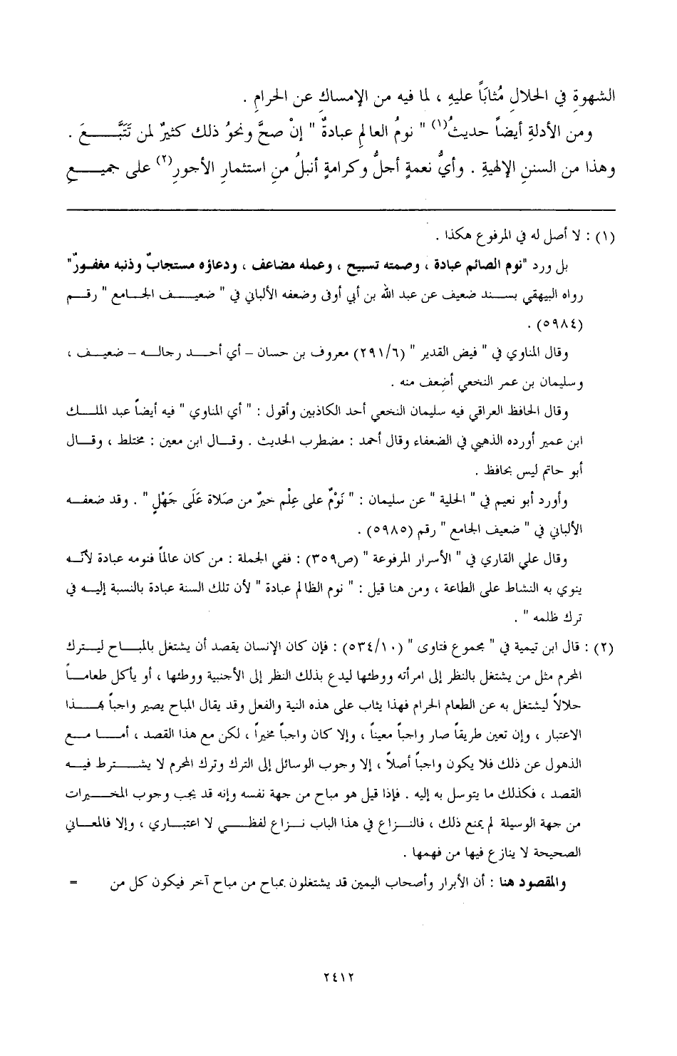 وأورد أبو نعيم في «الحلية» عن سليمان: «نوم على علم خير من صلاة على جهل». وقد ضعفه الألباني في «ضعيف الجامع» رقم (5985). وقال علي القاري في «الأسرار المرفوعة» (ص 359): ففي الجملة: من كان عالمًا فنومه عبادة؛ لأنه ينوي به النشاط على الطاعة، ومن هنا قيل: «نوم الظالم عبادة»؛ لأن تلك السنة عبادة بالنسبة إليه في ترك ظلمه.% «نوم العالم عبادة» إن صح ونحو ذلك كثير لمن تتبع. وهذا من السنن الإلهية. وأي نعمة أجل وكرامة أنيل من استثمار الأجور