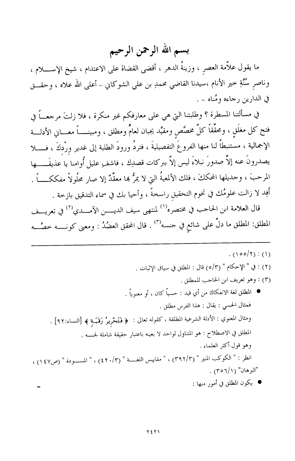 3 - أول الرسالة بسم الله الرحمن الرحيم. ما يقول علامة العصر، وزينة الدهر، أقضى القضاة على الاعتدام شيخ الإسلام، وناصر سنة خير الأنام سيدنا القاضي محمد بن علي الشوكاني، أعلى الله علاه، وحقق في الدارين رجاءه ومناه ...
