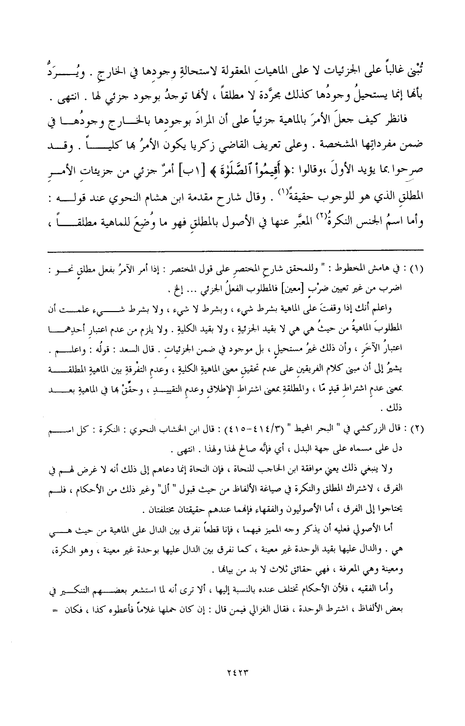 فانظر كيف جعل الأمر بالماهية جزئيًّا على أن المراد بوجودها بالخارج وجودها في ضمن مفرداتها المشخصة. وعلى تعريف القاضي زكريا يكون الأمر بها كليًّا. وقد صرحوا بما يؤيد الأول، وقالوا: {أقيموا الصلاة} [1 ب] أمر جزئي من جزئيات الأمر المطلق الذي هو للوجوب حقيقة (¬1) قال الزركشي في «البحر المحيط» (3/ 414 - 415): قال ابن الخشاب النحوي: النكرة: كل اسم دل على مسماه على جهة البدل؛ أي فإنه صالح لهذا ولهذا. انتهى.