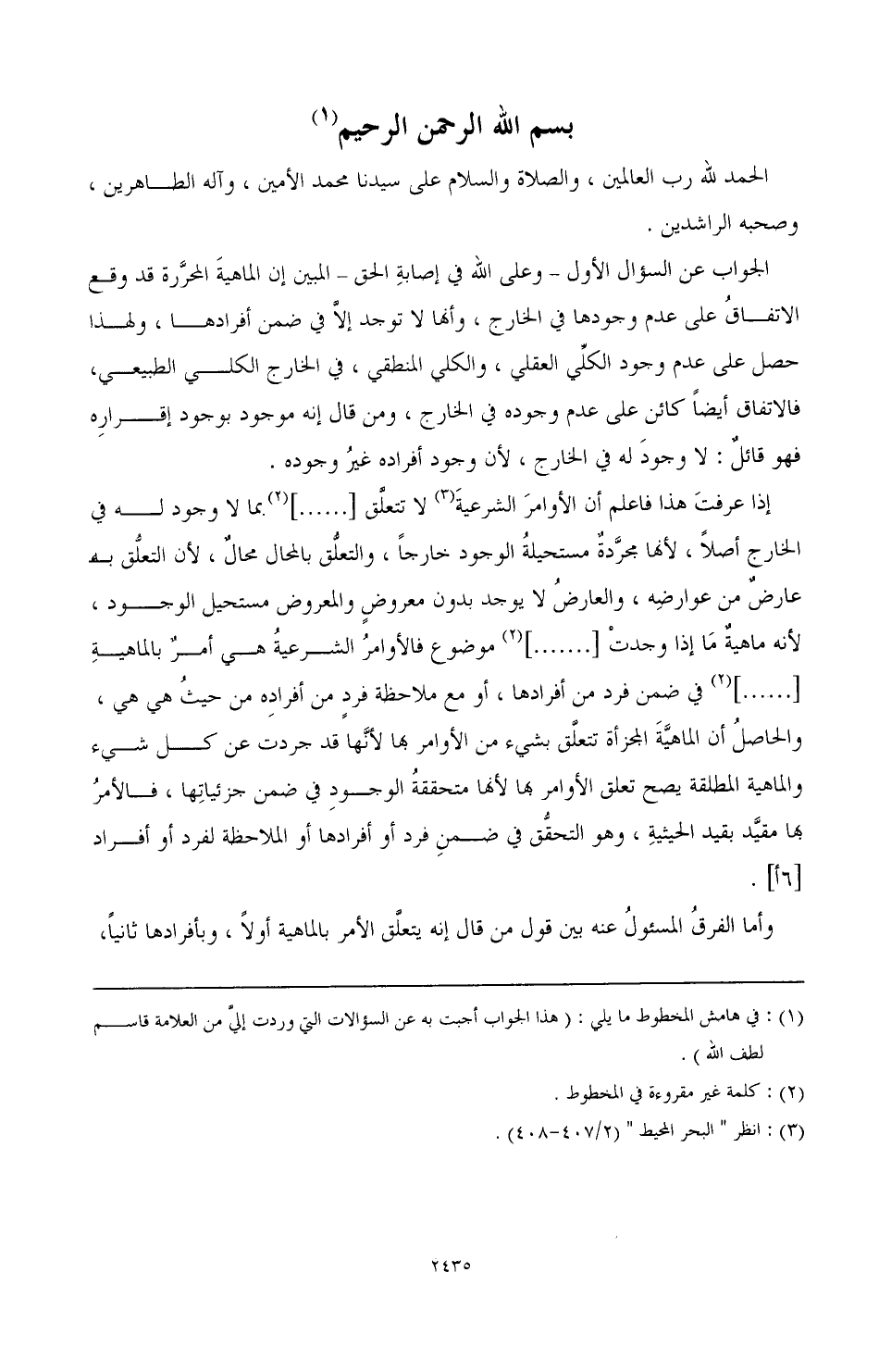 (¬3) كلمة غير مقروءة في المخطوط.% موضوع، فالأوامر الشرعية هي أمر بالماهية [ .. ]