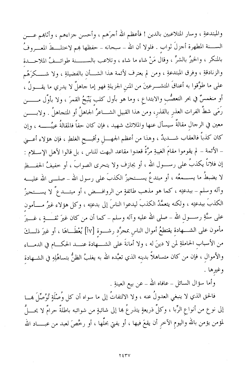 والمبتدعة، وسار المتلاعبين بالدين! فأعظم الله أجرهم، وأحسن جزاءهم، وأثابهم عن السنة المطهرة أجزل ثواب. فلولا أن الله- سبحانه- حفظها بهم لاختلط المعروف بالمنكر، والخير بالشر، وقال من شاء ما شاء، وتلاعب بالسنة طوائف الملاحدة على ما طوقوا به أعناق المتشرعين من المنن الجزيلة فهو إما جاهل لا يدري ما يقول، أو منغمس في بحر التعصب والابتداع، وما هو بأول كلب ينبح القمر، ولا بأول من رمى شط الفرات العذر بالقذر، ومن هذا القبيل الشاعر الجاهل أو المتجاهل. ولابن معين في الرجال مقالة سيسأل عنها والملائك شهيد، فإن كان حقًّا فالمقالة عيبه، وإن كان كذبًا فالعقاب شديد، وهذا من أعظم الجهل وأقبح الغلط، فإن هؤلاء أعني - الأئمة- لم يقوموا مقام الغيبة مرة قعدوا مقاعد البهت للناس، بل قالوا لأهل الإسلام: إن فلانًا يكذب على رسول الله، أو يجازف ولا يتحرى الصواب، أو خفيف الحفظ لا يضبط ما يسمعه، أو مبتدع يستجيز الكذب على رسول الله- صَلَّى اللهُ عَلَيْهِ وَآلِهِ وَسَلَّمَ- ببدعته، كما هو مذهب طائفة من الروافض، أو مبتدع لا يستجيز الكذب ببدعته، ولكنه يتعمد الكذب ليدعوا الناس إلى بدعته، وكل هؤلاء غير مأمون على سنة رسول الله- صَلَّى اللهُ عَلَيْهِ وَآلِهِ وَسَلَّمَ- كما أن من كان غير ثقة، غير مأمون على الشهادة يقتطع أموال الناس بمجرد رشوة [7 أ] يعطاها، أو غير ذلك من الأسباب الحاملة لمن لا دين له، ولا أمانة على الشهادة عند الحكام في الدماء والأموال، فإن من كان متساهلاً بدينه الذي تعبده الله به يغلب الظن بتساهله في الشهادة وغيرها.