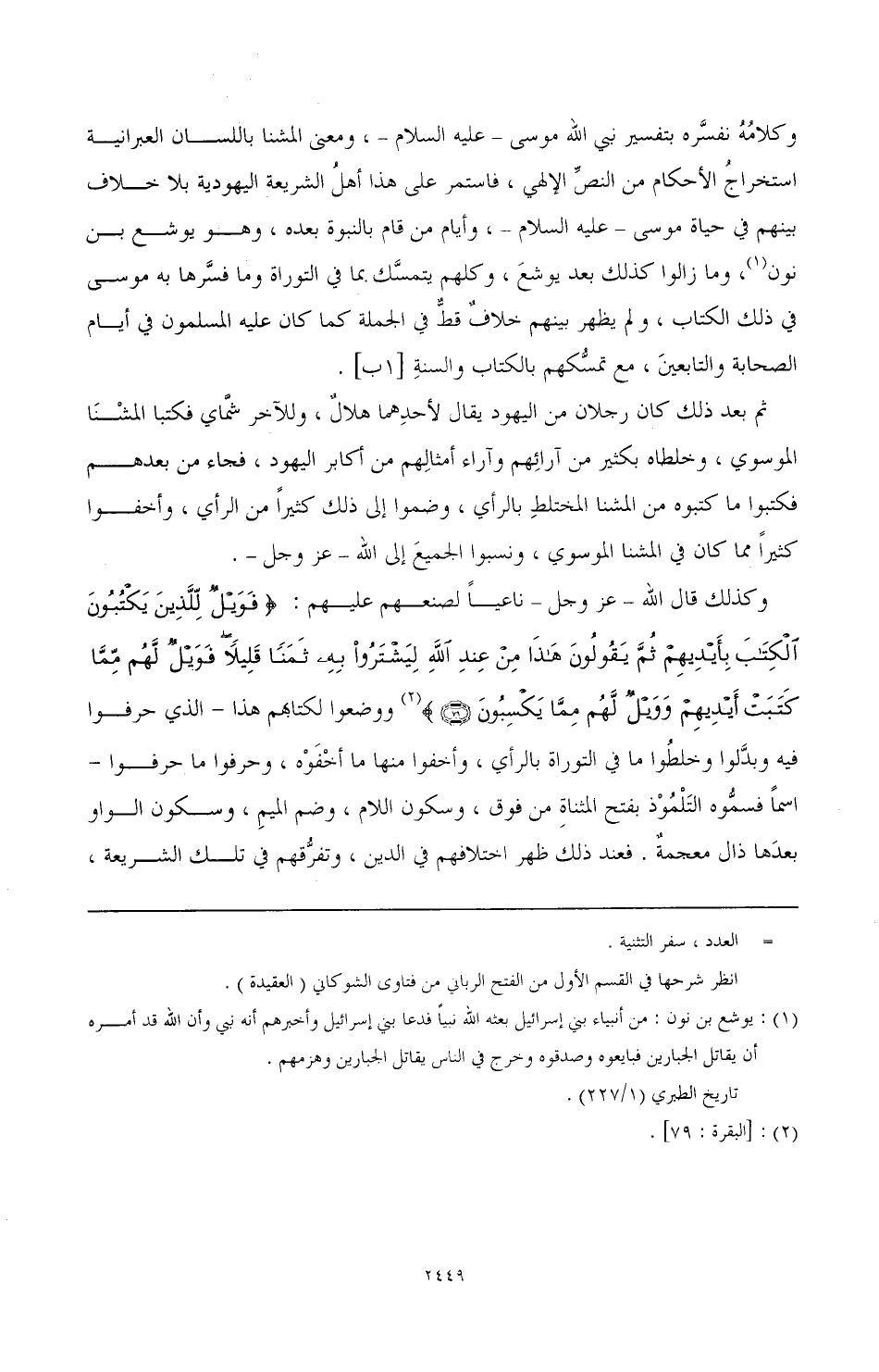 (¬1) يشوشع بن نون: من أنبياء بني إسرائيل بعثه الله نبيًّا فدعا بني إسرائيل وأخبرهم أنه نبي وأن الله قد أمره أن يقاتل الجبارين فبايعوه وصدقوه وخرج في الناس يقاتل الجبارين وهزمهم تاريخ الطبري (1/ 117).%، ومازالوا كذلك بعد يوشع، وكلهم يتمسك بما في التوراة وما فسرها به موسى في ذلك الكتاب، ولم يظهر بينهم خلاف قط في الجملة كما كان عليه المسلمون في أيام الصحابة والتابعين، مع تمسكهم بالكتاب والسنة [1 ب].
