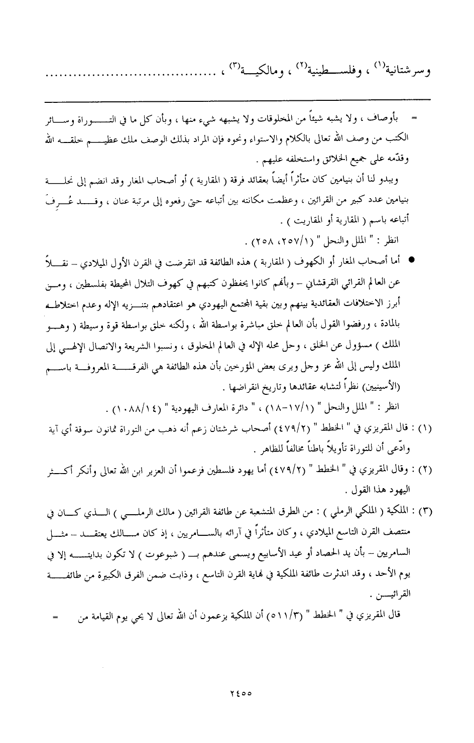 (¬1) قال المقريزي في «الخطط» (2/ 479): أصحاب شرشتان زعم أنه ذهب من التوراة ثمانون سوقة أي آية وادعى أن للتوراة تأويلاً مخالفًا للظاهر.