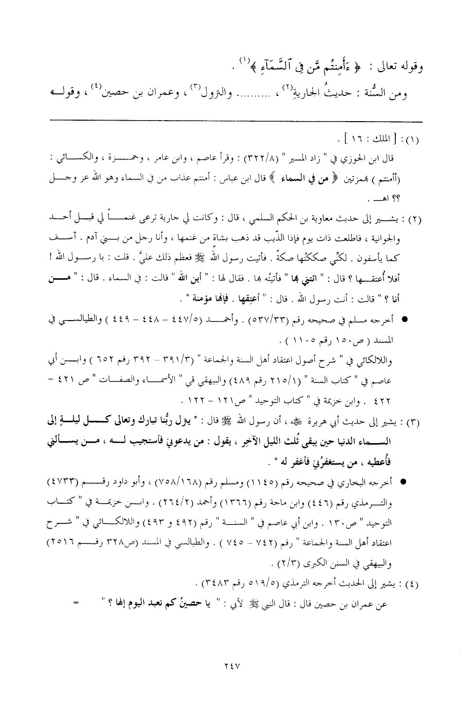 (¬2) يشير إلى حديث معاوية بن الحكم السلمي، قال: وكانت لي جارية ترعى غنما لي قبل أحد والجوانية، فاطلعت ذات يوم فإذا الذي قد ذهب بشاة من غنمها، وأنا رجل من بين آدم. آسف كما يأسفون. لكني صككتها صكة. فأتيت رسول الله صَلَّى اللهُ عَلَيْهِ وَسَلَّمَ فعظم ذلك علي. قلت: يا رسول الله! أفلا أعتقها؟ قال: " ائتني بها " فأتيته بها. فقال لها: " أين الله " قالت: في السماء. قال: " من أنا؟ قالت: أنت رسول الله. قال:" أعتقها، فإنها مؤمنة ".