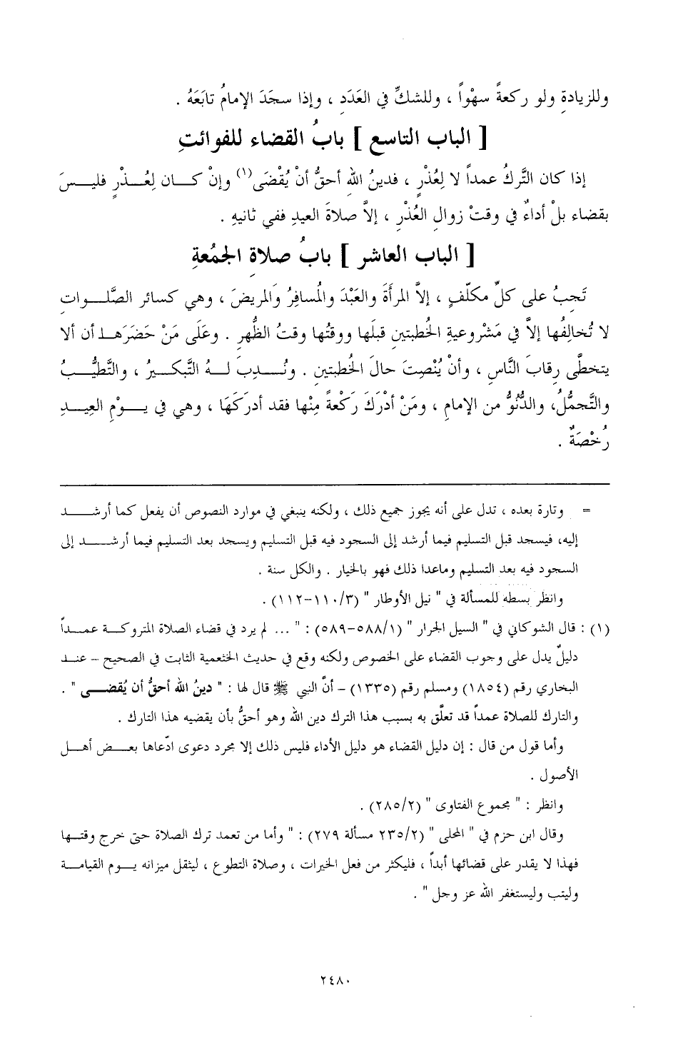 (¬1) قال الشوكاني في «السيل الجرار» (1/ 588 - 589): « ... لم يرد في قضاء لصلاة المتروكة عمدًا دليل على وجوب القضاء على الخصوص ولكنه وقع في حديث الخثعمية الثابت في الصحيح- عند البخاري رقم (1845) ومسلم رقم (1335) - أن النبي صَلَّى اللهُ عَلَيْهِ وَسَلَّمَ قال لها: «دين الله أحق أن يقضى».