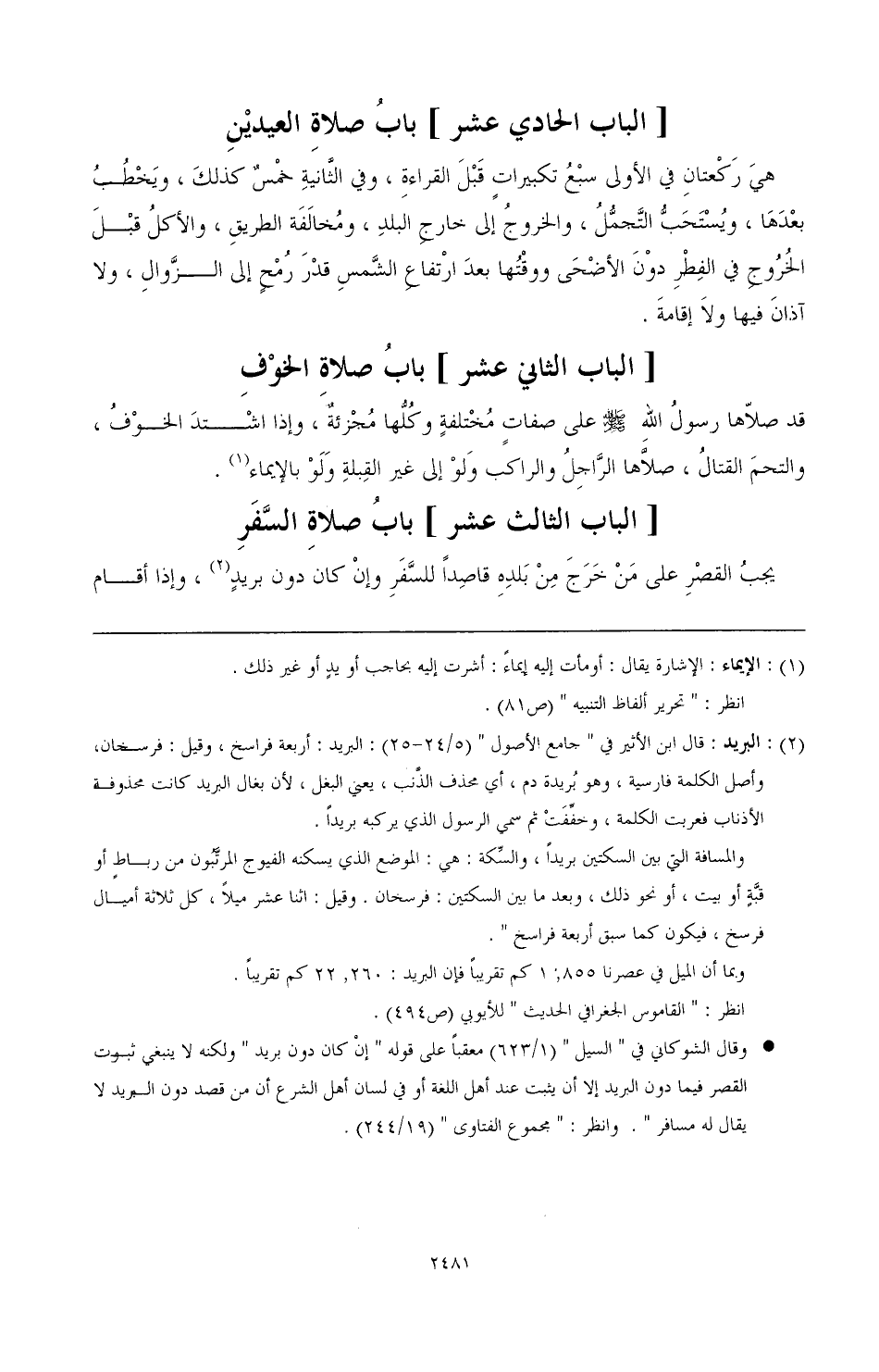 وقال الشوكاني في «السيل» (1/ 632) معقبًا على قوله «إن كان دون بريد» ولكنه لا ينبغي ثبوت القصر فيما دون البريد إلا أن يثبت عند أهل اللغة أو في لسان أهل الشرع أن من قصد دون البريد لا يقال له مسافر. والنظر: «مجموع الفتاوى» (19/ 244).