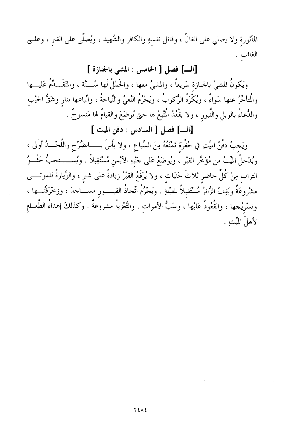 ويجب دفن الميت في حفرة تمنعه من السباع، ولا بأس بالضرح واللحد أولى، ويدخل الميت من مؤخر القبر، ويوضع على جنبه الأيمن مستقبلًا. ويستحب حثو التراب من كل حاضر ثلاث حثيات، ولا يرفع القبر زيادة على شبر، والزيارة للموتى مشروعة ويقف الزائر مستقبلًا للقبلة، ويحرم اتخاذ القبور مساجد، وزخرفتها، وتسريحها، والقعود عليها، وسب الأموات , والتعزية مشروعة. وكذلك: إهداء الطعام لأهل الميت.
