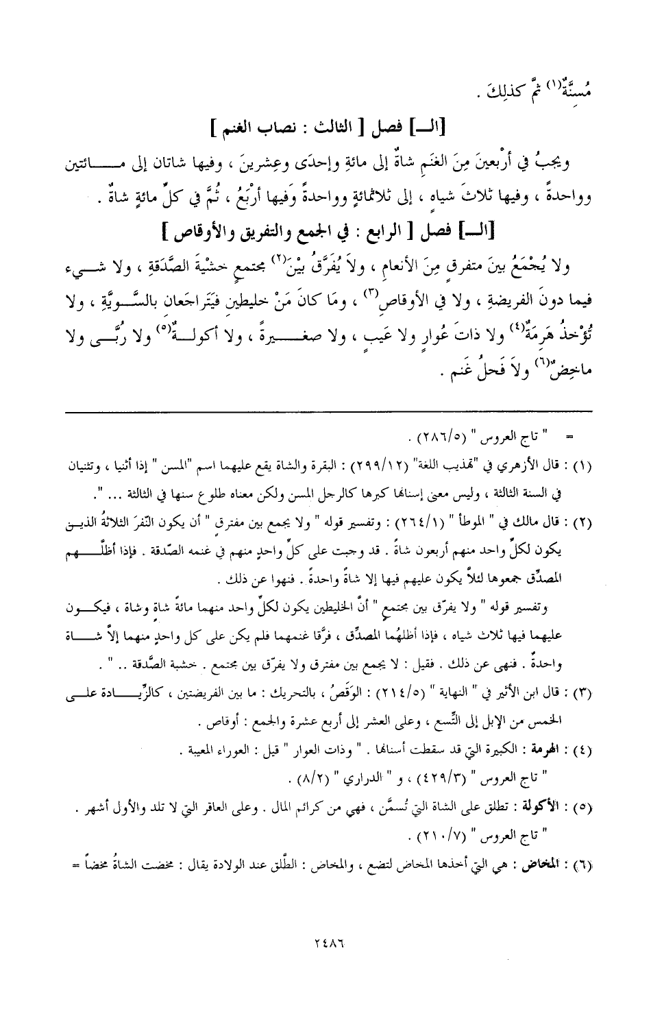 (¬2) قال مالك في «الموطأ» (1/ 264): وتفسير قوله: «ولا يجمع بين مفترق» أن يكون النفر الثلاثة الذين يكون لكل واحد منهم أربعون شاة. قد وجبت على كل واحد منهم في غنمه الصدقة. فإذا أظلهم المصدق جمعوها لئلا يكون عليهم فيها إلا شاة واحدة. فنهوا عن ذلك.
